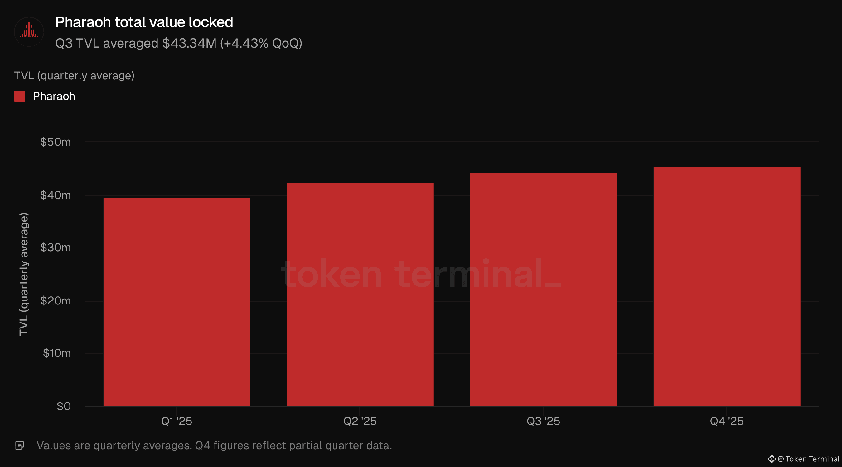 Total value locked (TVL) measures the total USD value of assets deposited in Pharaoh's liquidity pools on Avalanche. Q3 TVL averaged $44.34M, up from $42.46M in Q2 (+4.43% QoQ).