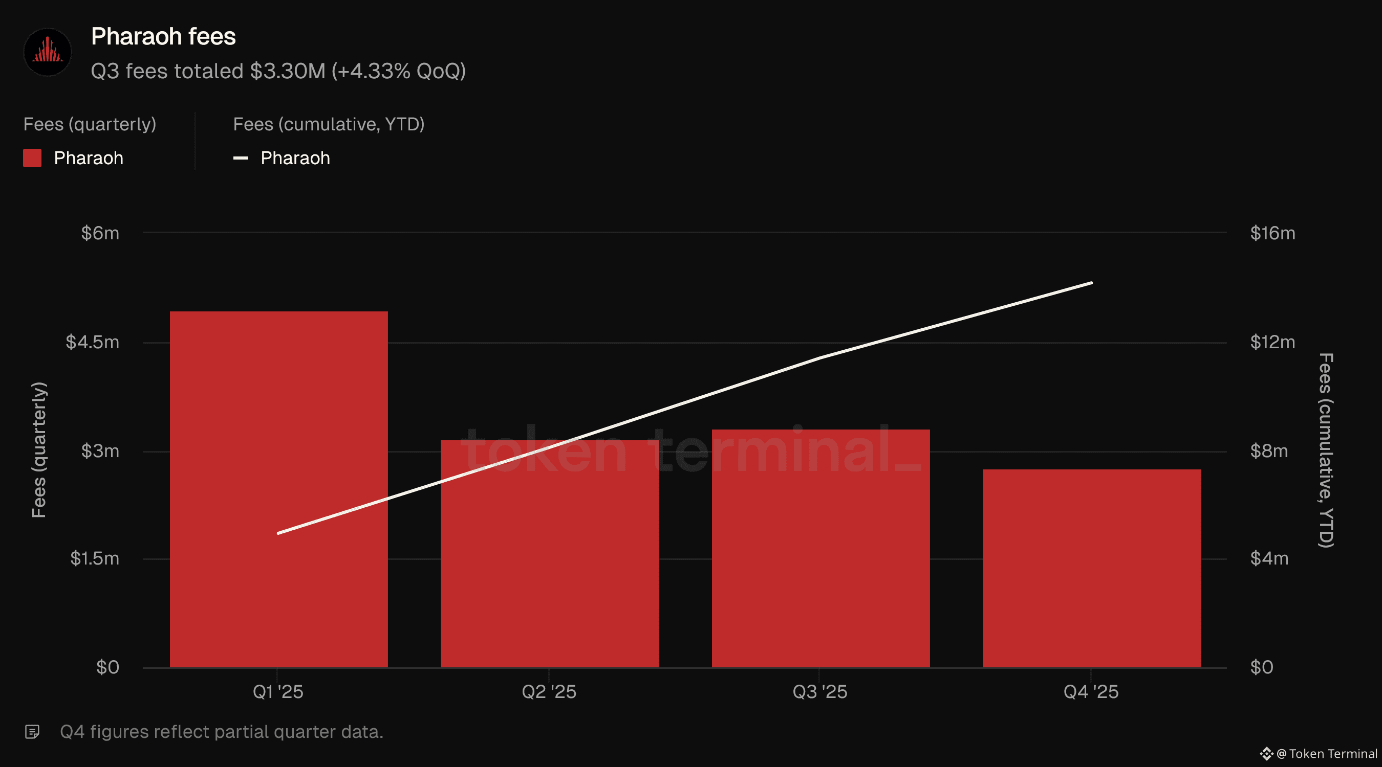 Fees measure the USD value of token rewards distributed to users by Pharaoh on Avalanche. Q3 fees totaled $3.30M, up from $3.16M in Q2 (+4.33% QoQ).