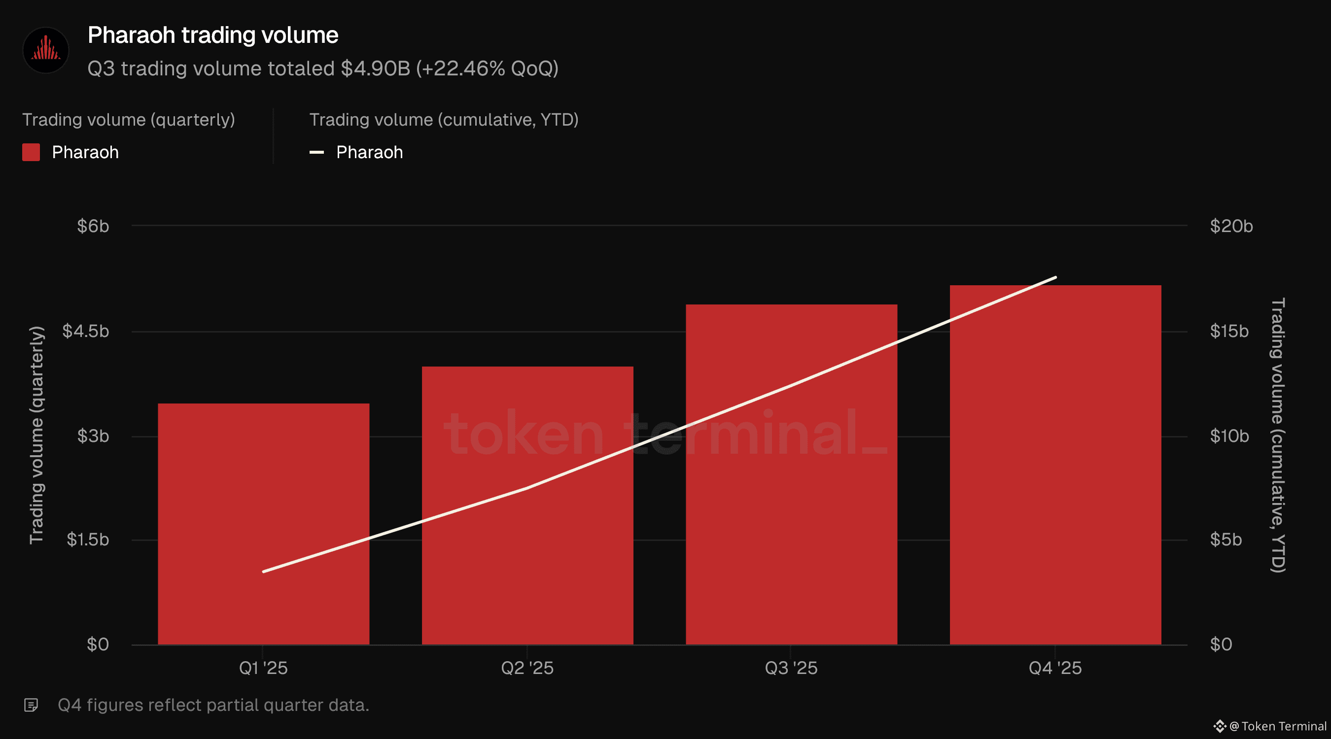 Trading volume measures the total USD value of all trading activity on Pharaoh's decentralized exchange on Avalanche. Q3 trading volume totaled $4.90B, up from $4.00B in Q2 (+22.46% QoQ).