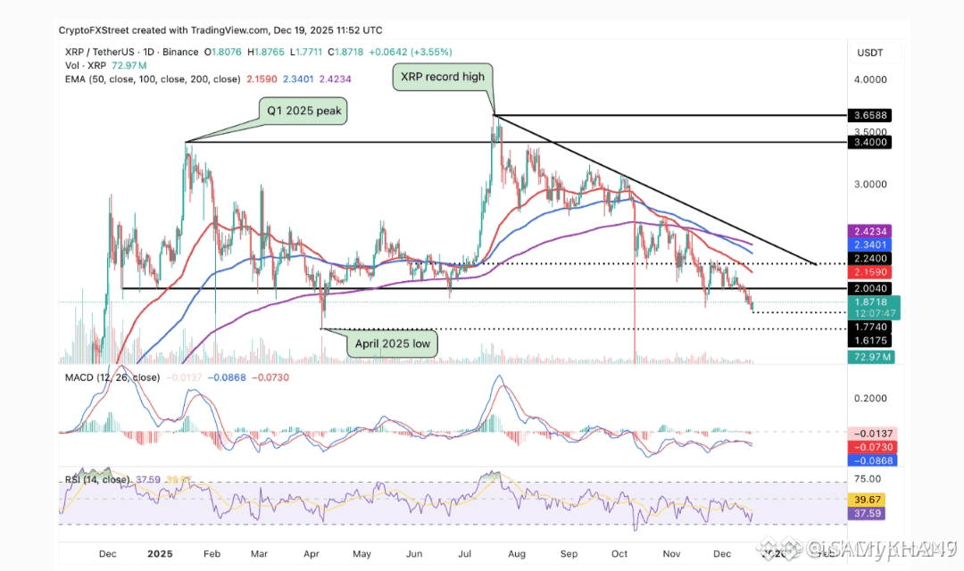 The broader trend remains bearish, as XRP continues to trade below its key exponential moving averages: