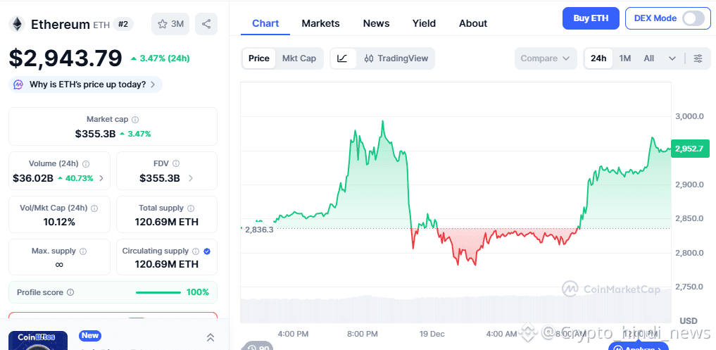 CMC के डेटा के अनुसार, पिछले 24 घंटों में Ethereum लगभग 2.47% बढ़कर $2,943 तक पहुंच गया है। इस दौरान इसके ट्रेडिंग वॉल्यूम में भी 40% से अधिक की बढ़ोतरी दर्ज की गई है, जो बढ़ती हुई एक्टिविटी को दर्शाता है।
