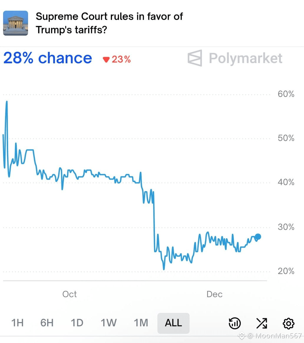 За даними Polymarket, учасники ринку оцінюють ймовірність того, що ⚖️ Верховний суд США визнає тарифну політику Дональда Трампа незаконною, на рівні ~72%.