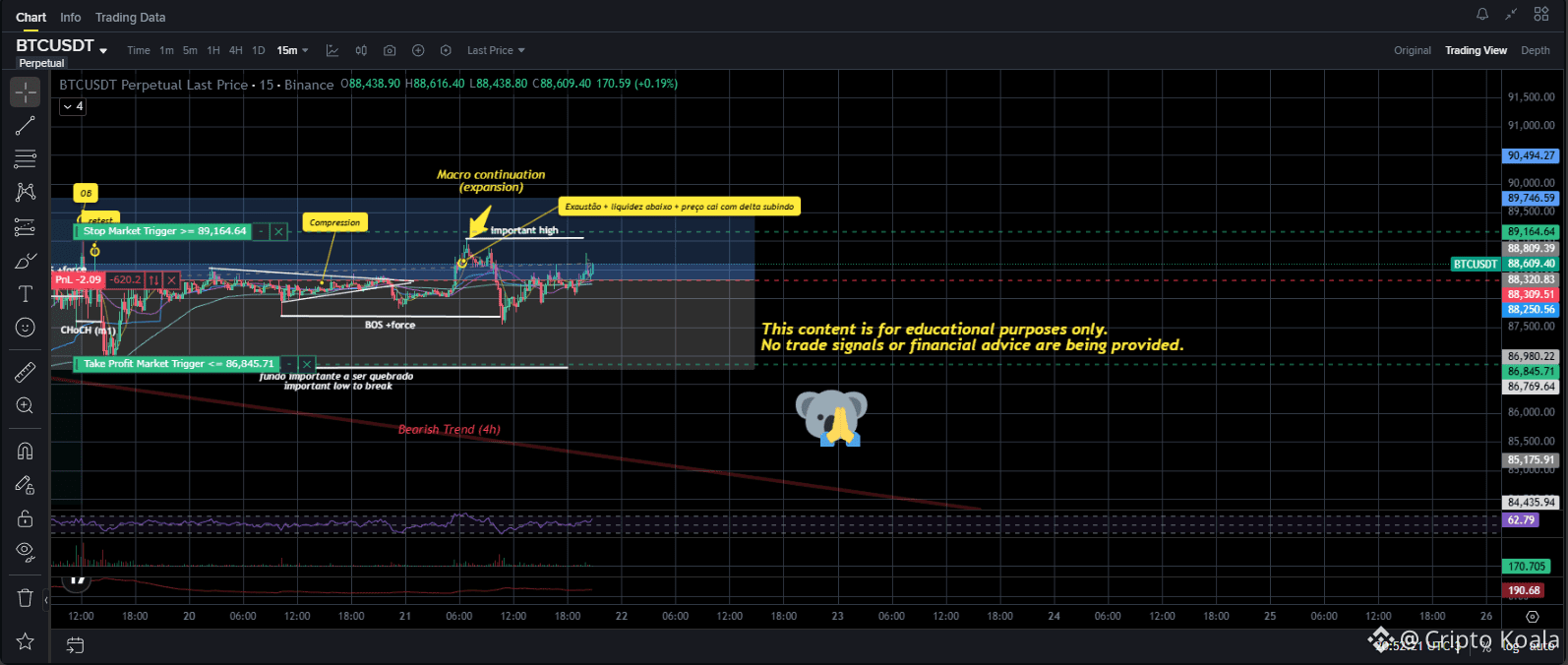 Características: BOS sem continuidade, CHoCH confusos, deslocamentos curtos e testes constantes de liquidez.