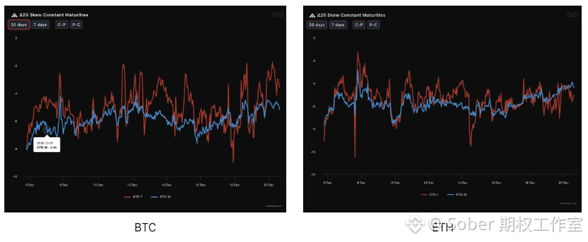 通过Delta 25 Skew(看涨期权隐含波动率IV - 看跌期权IV)观察,该指标的负值幅度反映了市场对下行尾部风险的对冲需求。