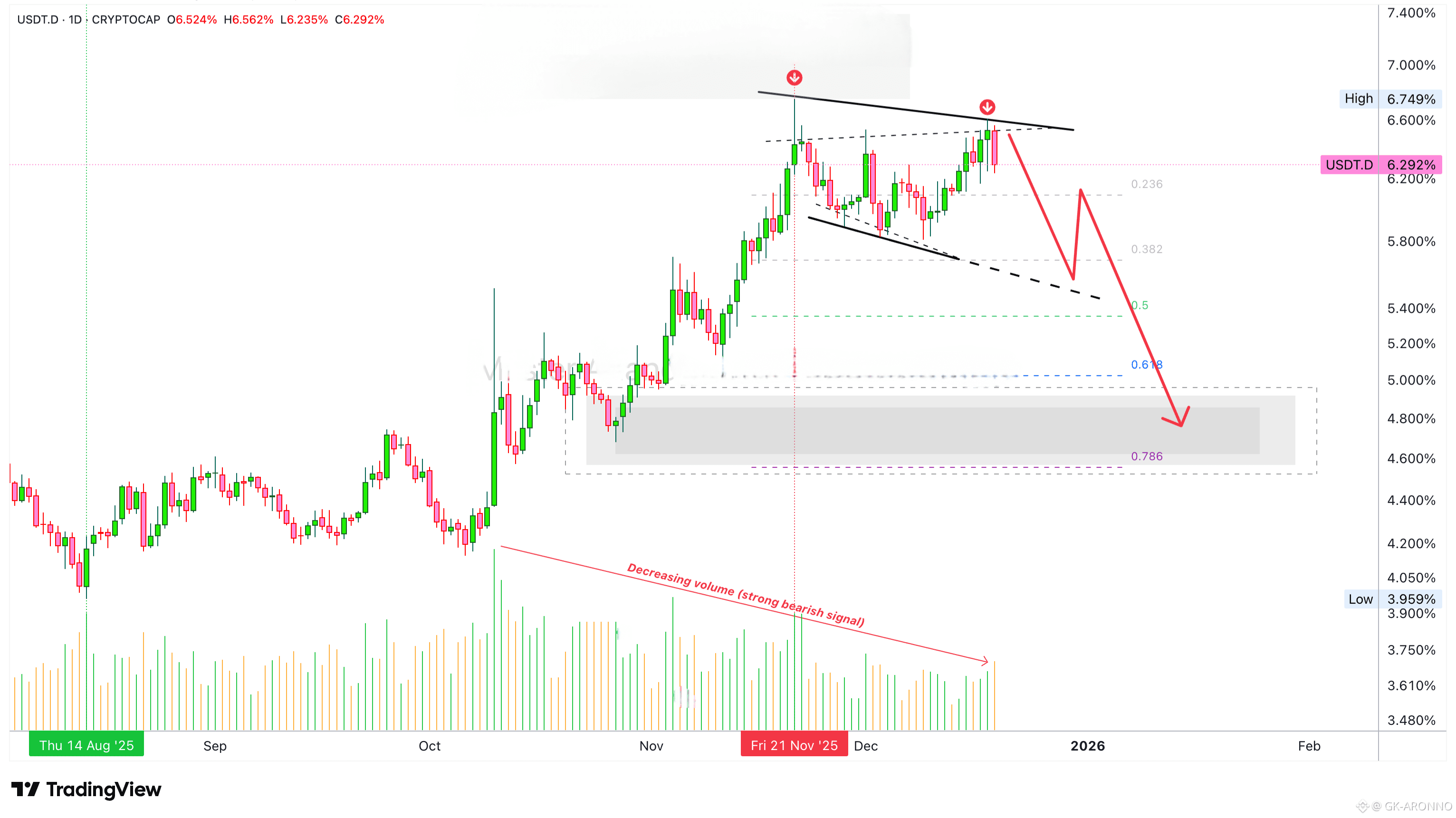 Tether Dominance had one last hoorah yesterday, still, a lower high. Today we have a volume breakout on the bearish side. We are seeing the highest volume in a month, since 18-November, coupled with a big red candle. This big red candle today confirms the lower high yesterday. This index is going down, there is no going back.
