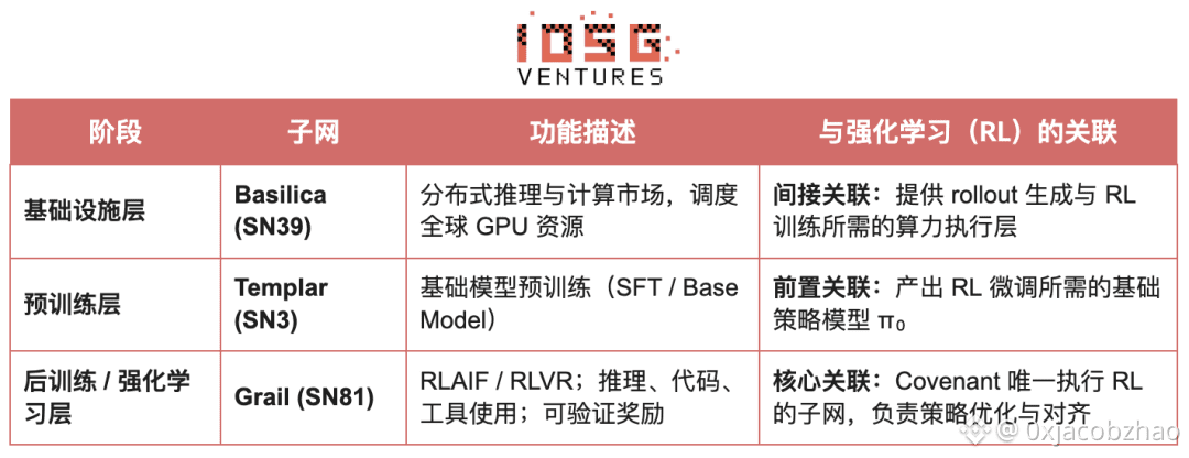 Bittensor生态中的Covenant AI 则通过 SN3 Templar、SN39 Basilica 与 SN81 Grail 构建了从预训练到 RL 后训练的垂直一体化流水线。其中,SN3 Templar 负责基础模型的预训练,SN39 Basilica 提供分布式算力市场,SN81 Grail 则作为面向 RL 后训练的“可验证推理层”,承载 RLHF / RLAIF 的核心流程,完成从基础模型到对齐策略的闭环优化。