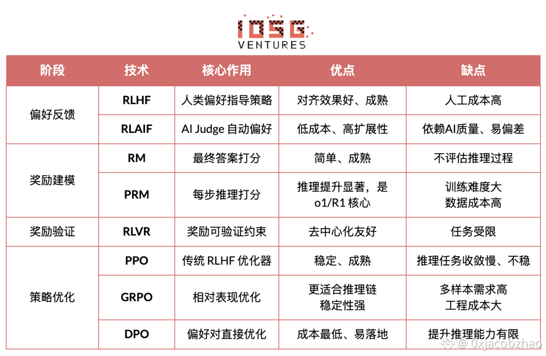 后训练(Post-training)由多个迭代子阶段构成,决定模型的推理能力、价值观与安全边界,其方法既包括强化学习体系(RLHF、RLAIF、GRPO)也包括无 RL 的偏好优化方法(DPO),以及过程奖励模型(PRM)等。该阶段数据量与成本较低(5–10%),主要集中在 Rollout 与策略更新;其天然支持异步与分布式执行,节点无需持有完整权重,结合可验证计算与链上激励可形成开放的去中心化训练网络,是最适配 Web3 的训练环节。