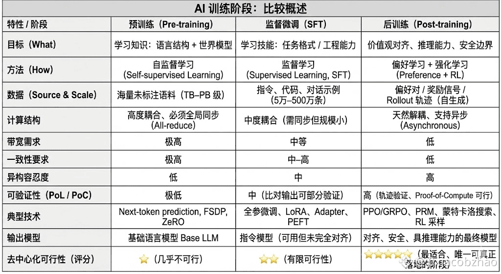 现代大语言模型(LLM)训练全生命周期通常被划分为三个核心阶段:预训练(Pre-training)、监督微调(SFT)和后训练(Post-training/RL)。三者分别承担“构建世界模型—注入任务能力—塑造推理与价值观”的功能,其计算结构、数据要求与验证难度决定了去中心化的匹配程度。