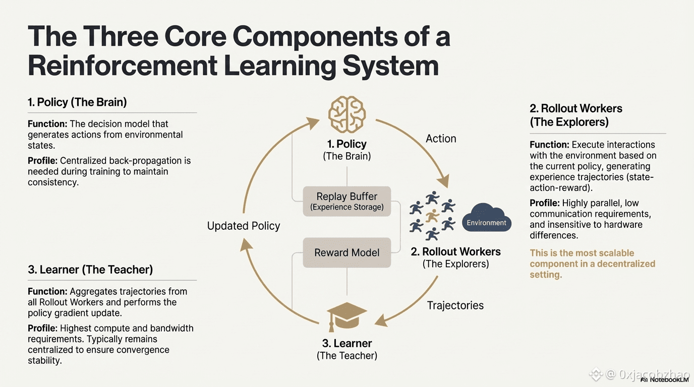 “推理—训练解耦”天然契合去中心化的异构算力结构:Rollout 可外包给开放网络,通过代币机制按贡献结算,而模型更新保持集中化以确保稳定性。
