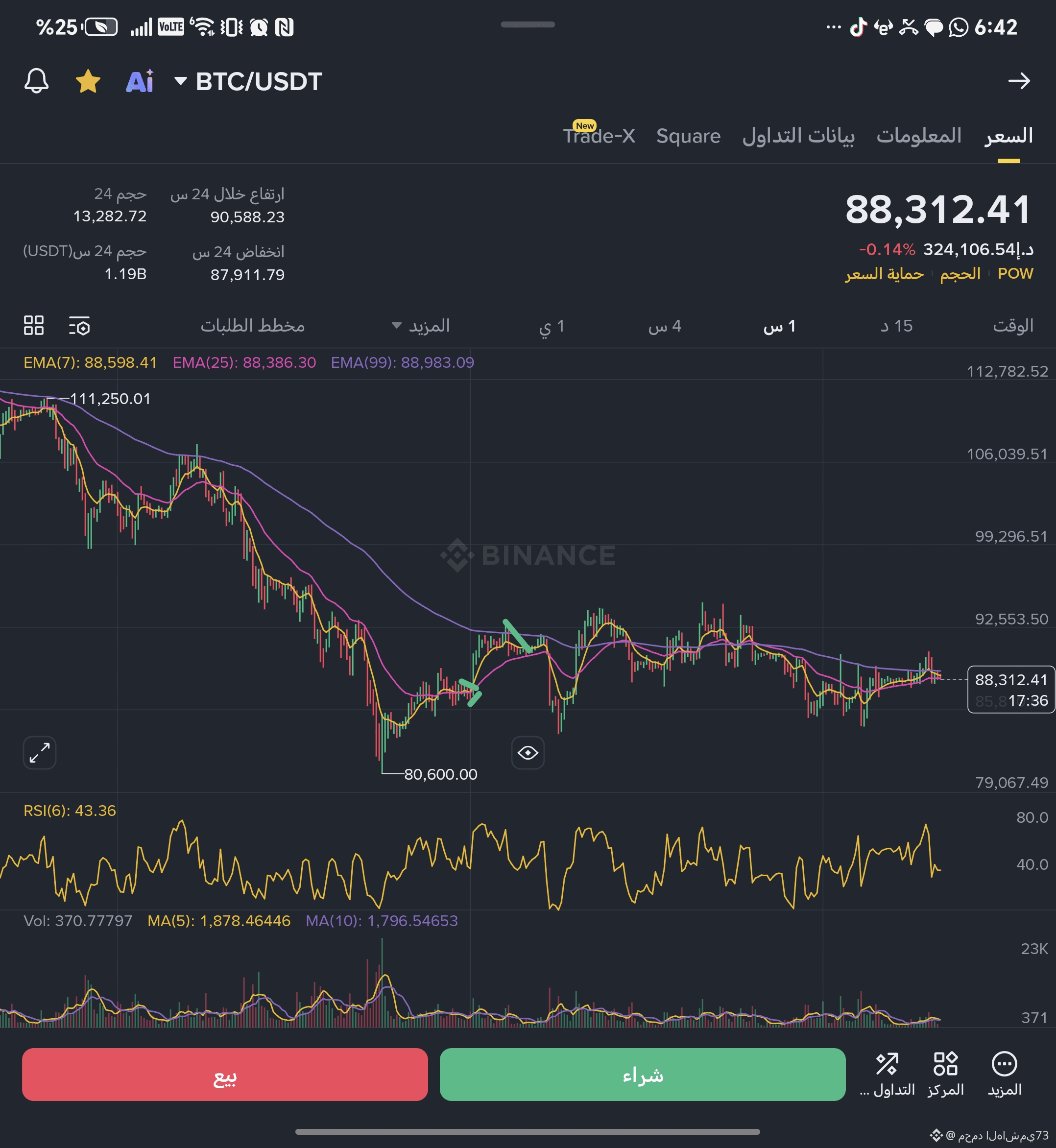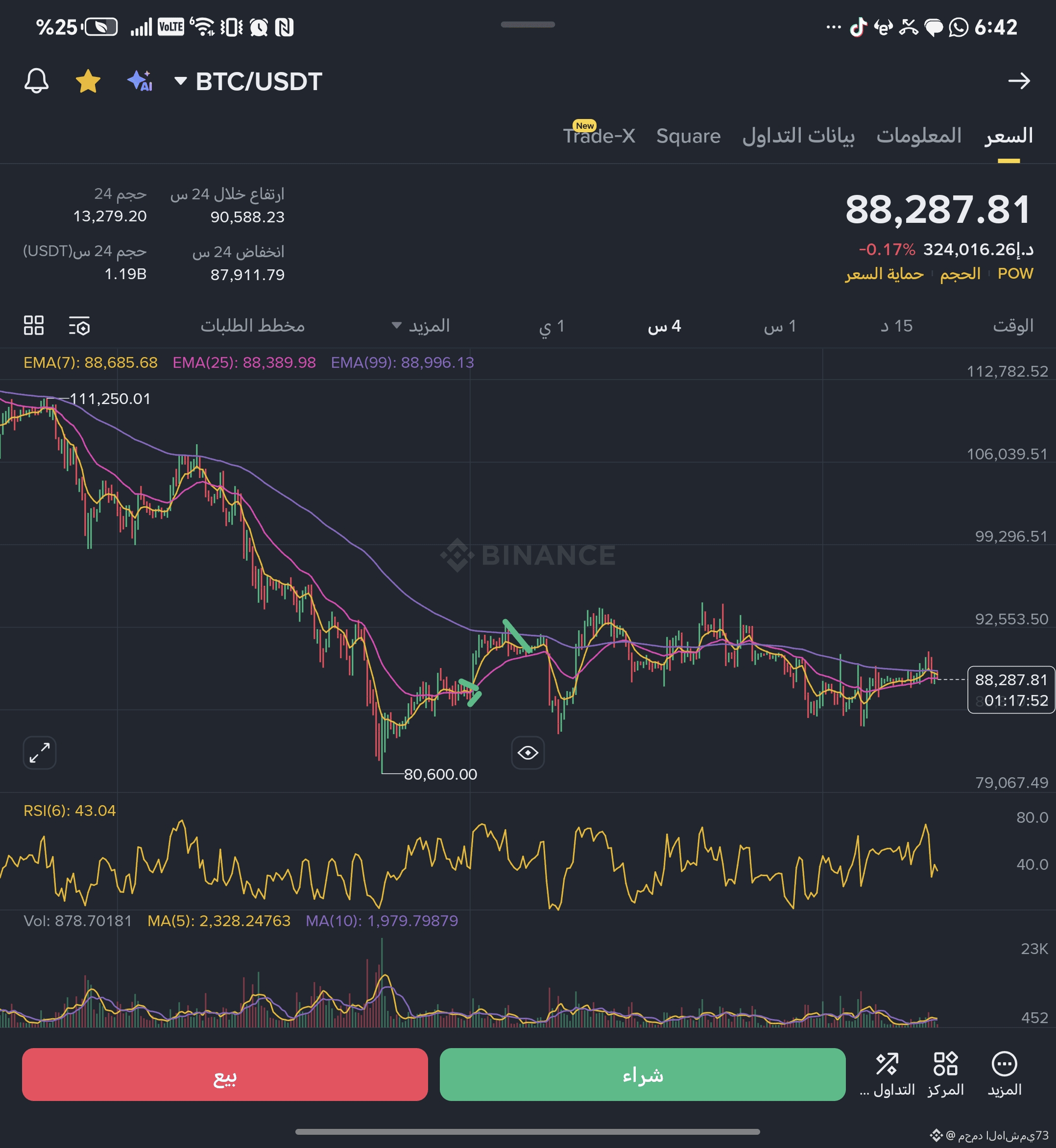 أسفل EMA 7 و EMA 25