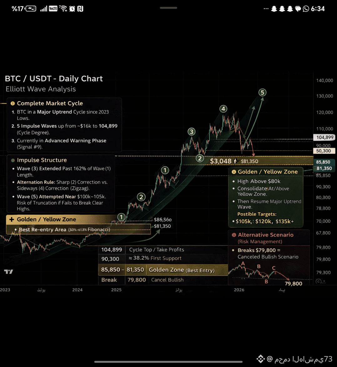 كسر 79,800$ بإغلاق يومي واضح → فشل السيناريو الصاعد مؤقتًا → تحوّل التصحيح إلى نموذج A-B-C أعمق → استهداف مناطق أقل لإعادة بناء دورة جديدة