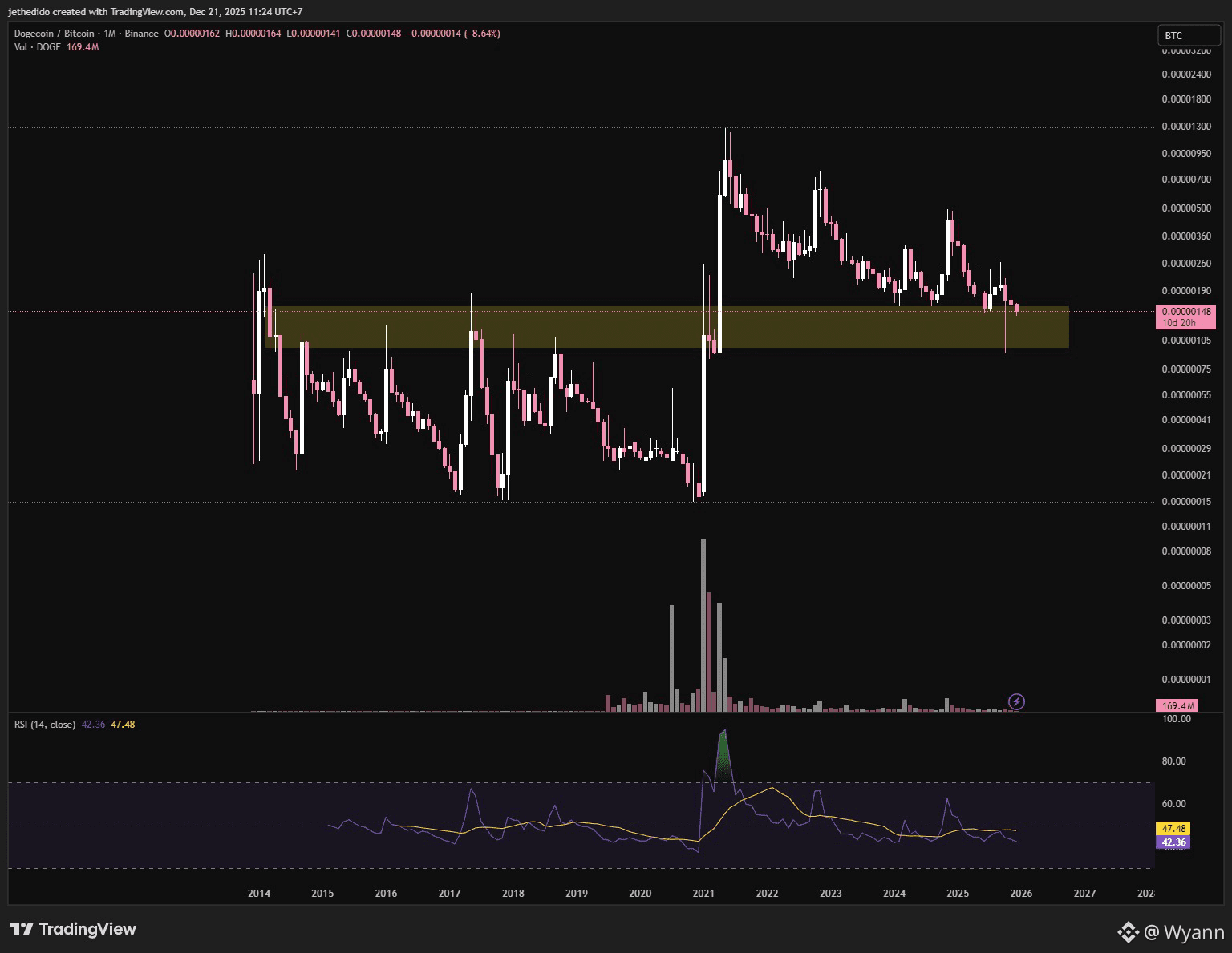 DOGE berada di area long-term support zone terhadap Bitcoin (DOGE/BTC)