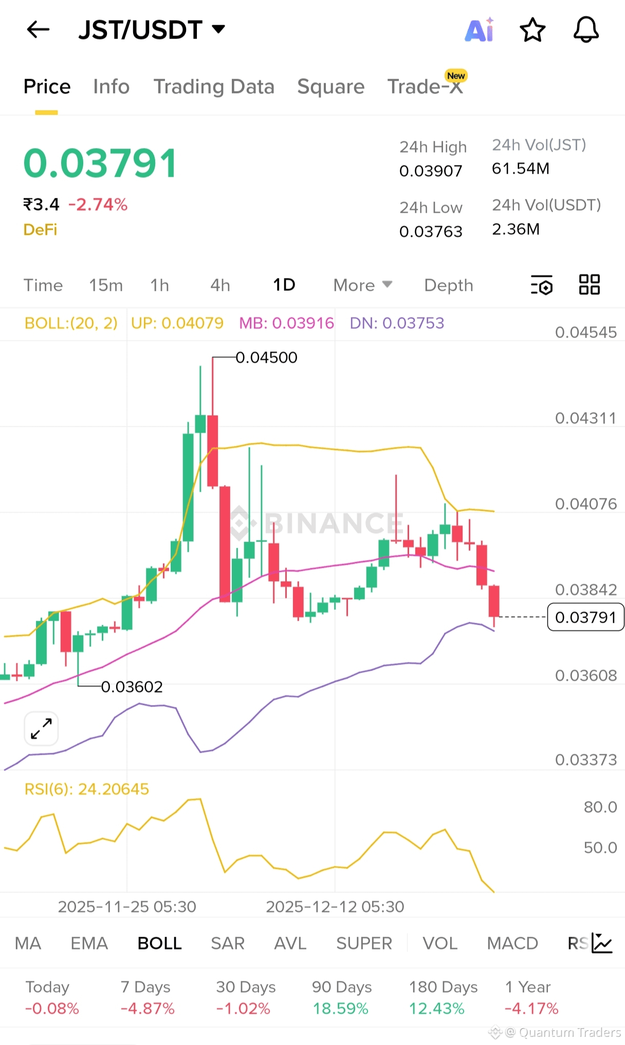 JST/USDT on the 1D looks weak right now; price is hugging the lower Bollinger Band after a multi‑day red move from the recent top around 0.045, so momentum is down and not a clean fresh long setup yet.