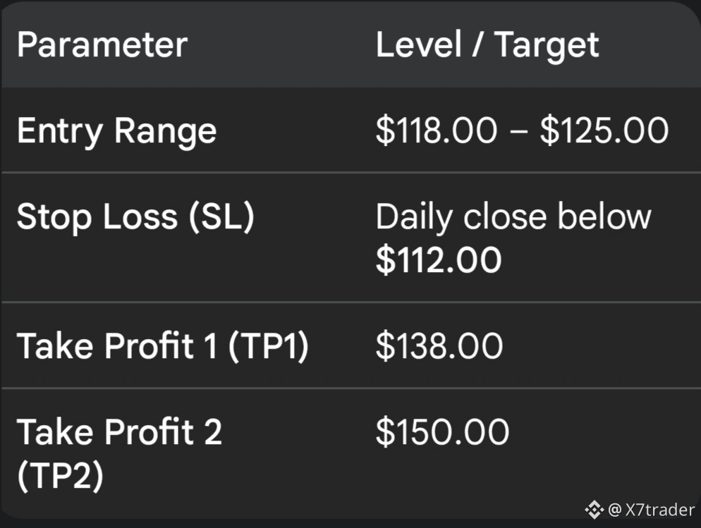 Risk Management: A daily close below $112 would invalidate this setup, suggesting further downside. Given the current volatility, a Spot-only approach is recommended to manage risk effectively.