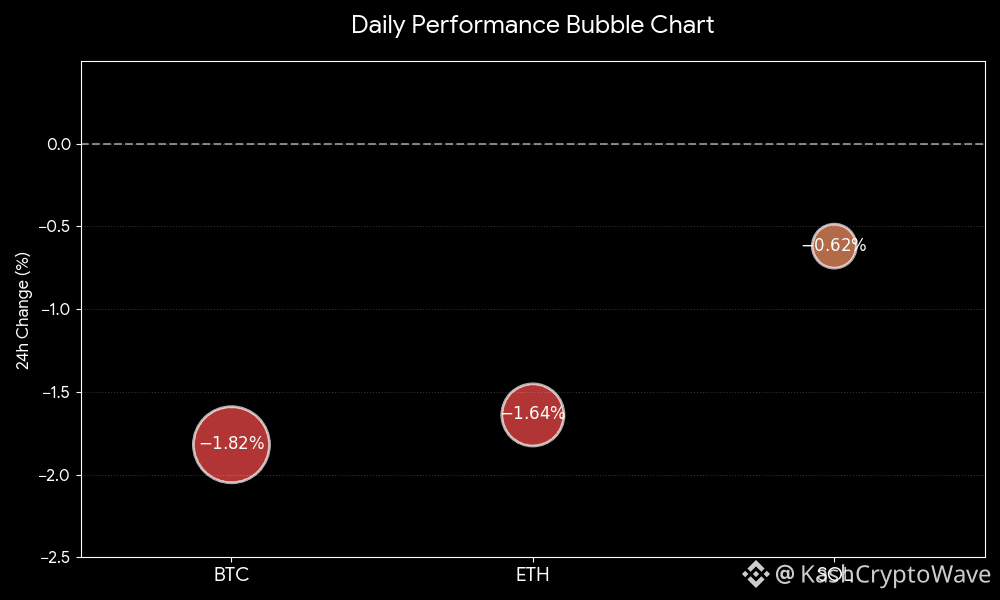 The current market structure is visualized through the daily performance bubble chart, highlighting the relative volatility across the top three assets. Bitcoin leads the decline with a 1.82% drop, followed closely by Ethereum at 1.64%. Solana continues to show higher relative strength compared to the market leaders,The current market structure is visualized through the daily performance bubble chart, highlighting the relative volatility across the top three assets. Bitcoin leads the decline with a 1.82% drop, followed closely by Ethereum at 1.64%. Solana continues to show higher relative strength compared to the market leaders, experiencing a more moderate pullbackof 0.62%