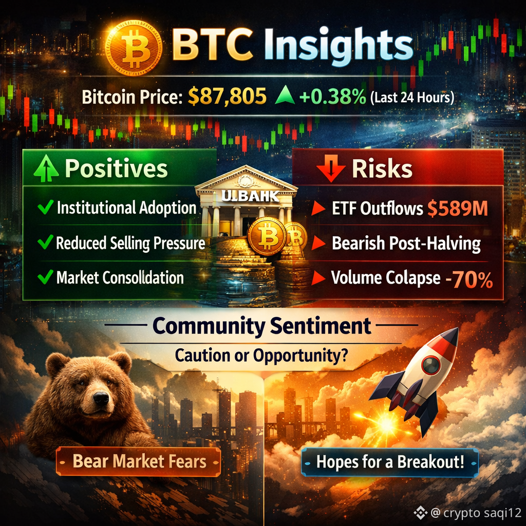 #BTC走势分析 Bitcoin's price increased by 0.38% over the last 24 hours to $87,805, reflecting mixed signals.