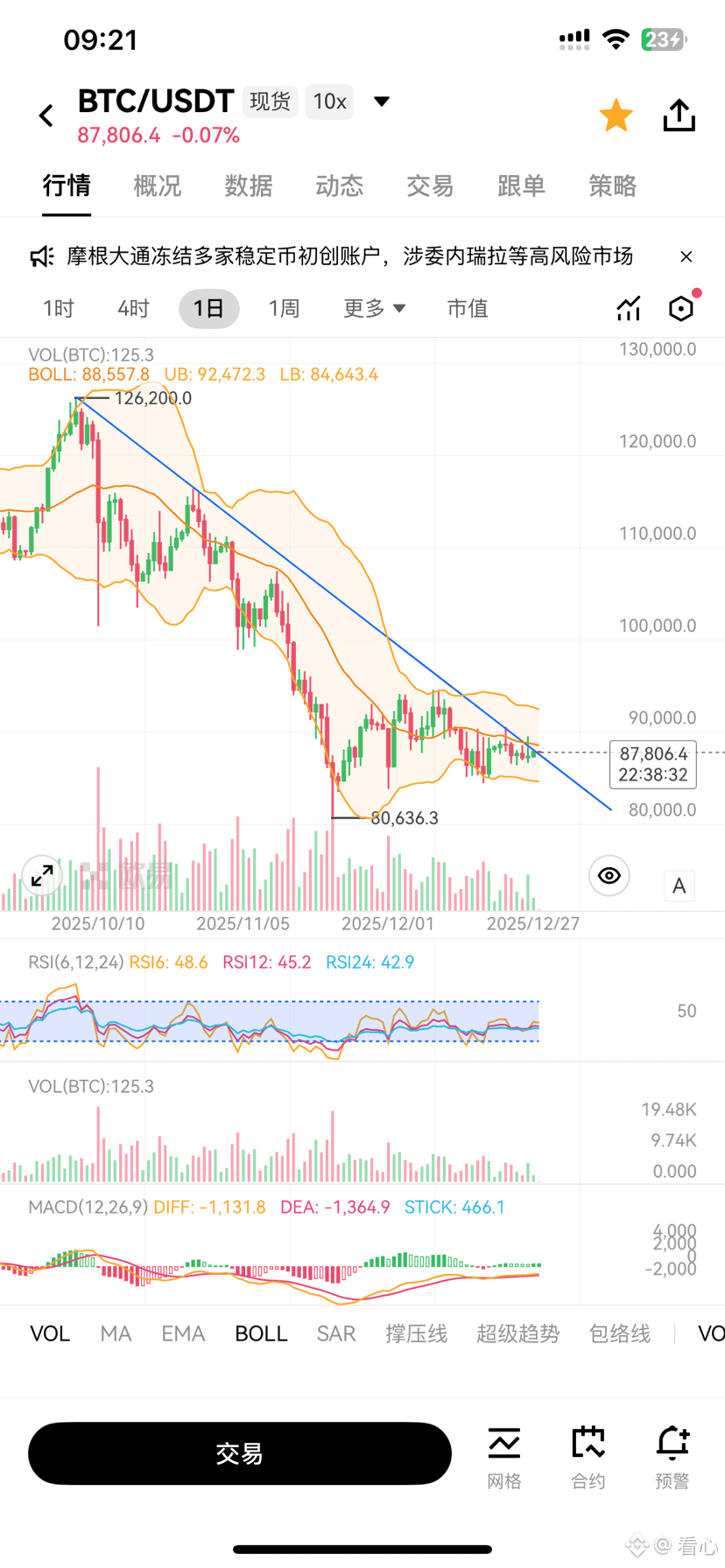 价格走势: 比特币目前交易价格约在 $87,000 左右。相较于2025年10月创下的 $126,000 历史高点,价格已回撤约 30%。在2025年12月27日和28日这周末,比特币(BTC)及加密货币市场呈现出与传统资产(如黄金、美股)显著“脱钩”的走势,市场情绪整体较为低迷,但是价格呈现出修复行情可能接近尾声的苗头,近期可能向上突破日线趋势线。如能顺利突破,且经过多次测试不会跌破,则可以期待一个明显的回弹。