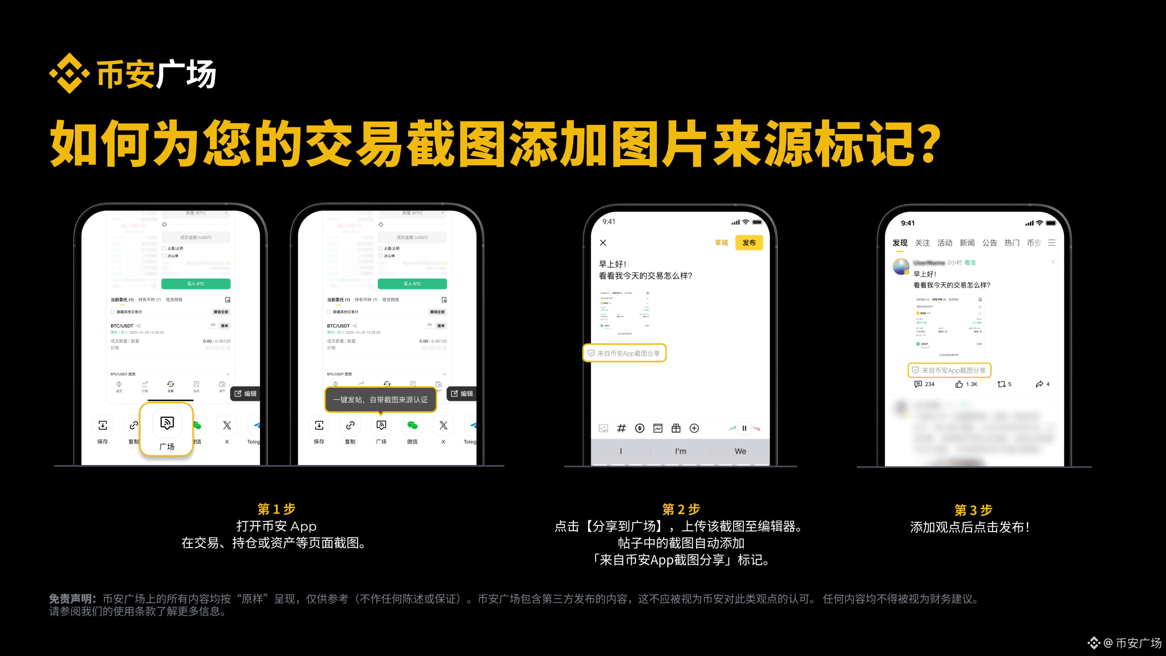 在交易、资产、盈亏分析等页面截图后,选择直接分享到【广场】,系统会自动为截图添加「来自币安App截图分享」标记。