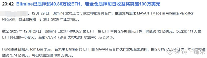 先看那个快讯,Bitmine手里囤了400多万个ETH,现在才质押了40万个,就号称每天能躺赚百万美金。这消息猛一看,是不是觉得“巨鲸锁仓,天大利好”?但咱们得拆开看:
