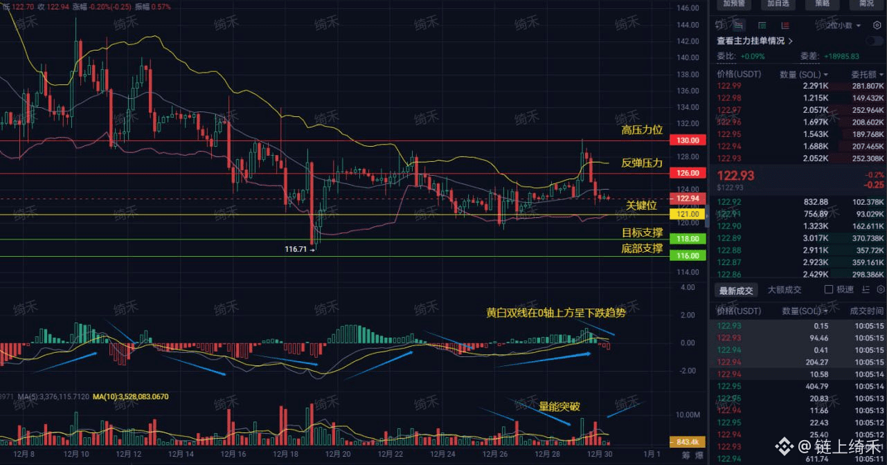 压力重重:上面黄线130是强压,紫色126是第一道坎。现在价格122.9,被压在126下面。