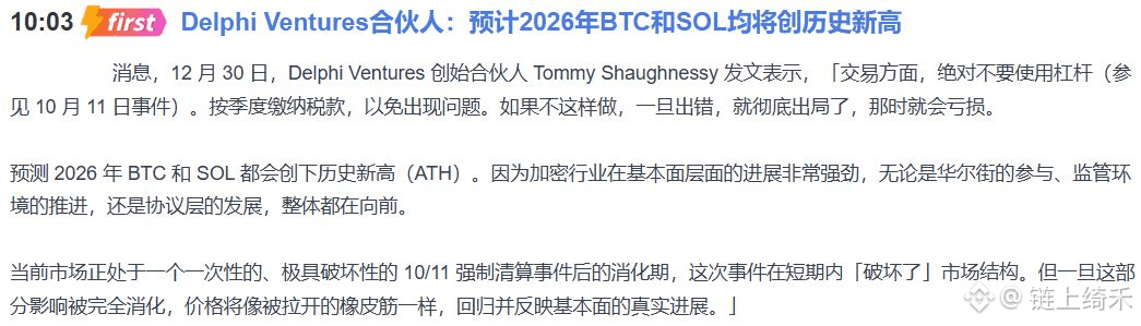 先看那条消息,Delphi Ventures的合伙人说2026年看历史新高,这话没错,我也信。华尔街进场、协议发展,这是长线的基本面,是“未来的糖”。但他开头第一句提醒是什么?“绝对不要使用杠杆”!这是血泪教训。他同时也说了,现在市场在消化10月的“强制清算”事件,就像一根被暴力拉开的橡皮筋。听懂了吗? 长线是“橡皮筋”会弹回去创新高,但短线,它正处在“松手后回弹前的那个消化、震荡期”。所以,别用“2026年的梦想”来指导“今晚的操作”。