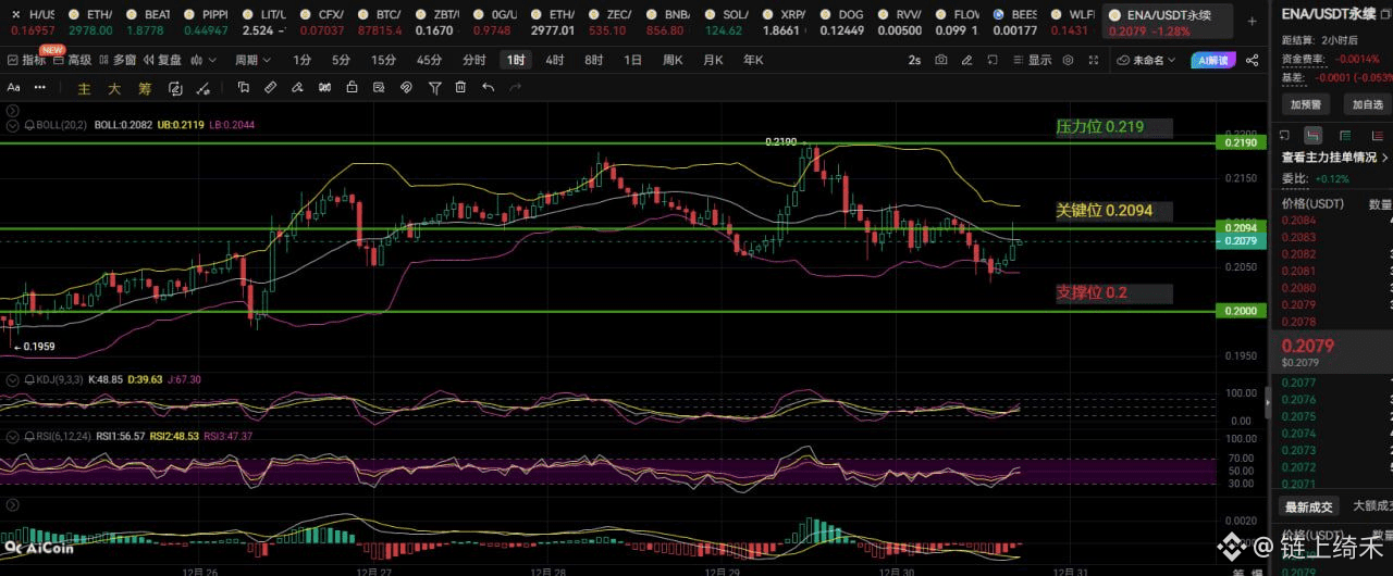 关键位置:上方铁顶压力在0.219,几次冲上去都被砸下来。中间有个生死线0.2094,目前价格在0.208附近,正好在这条线上挣扎。下面底线支撑是0.2,不能破,破了趋势可能就坏了。