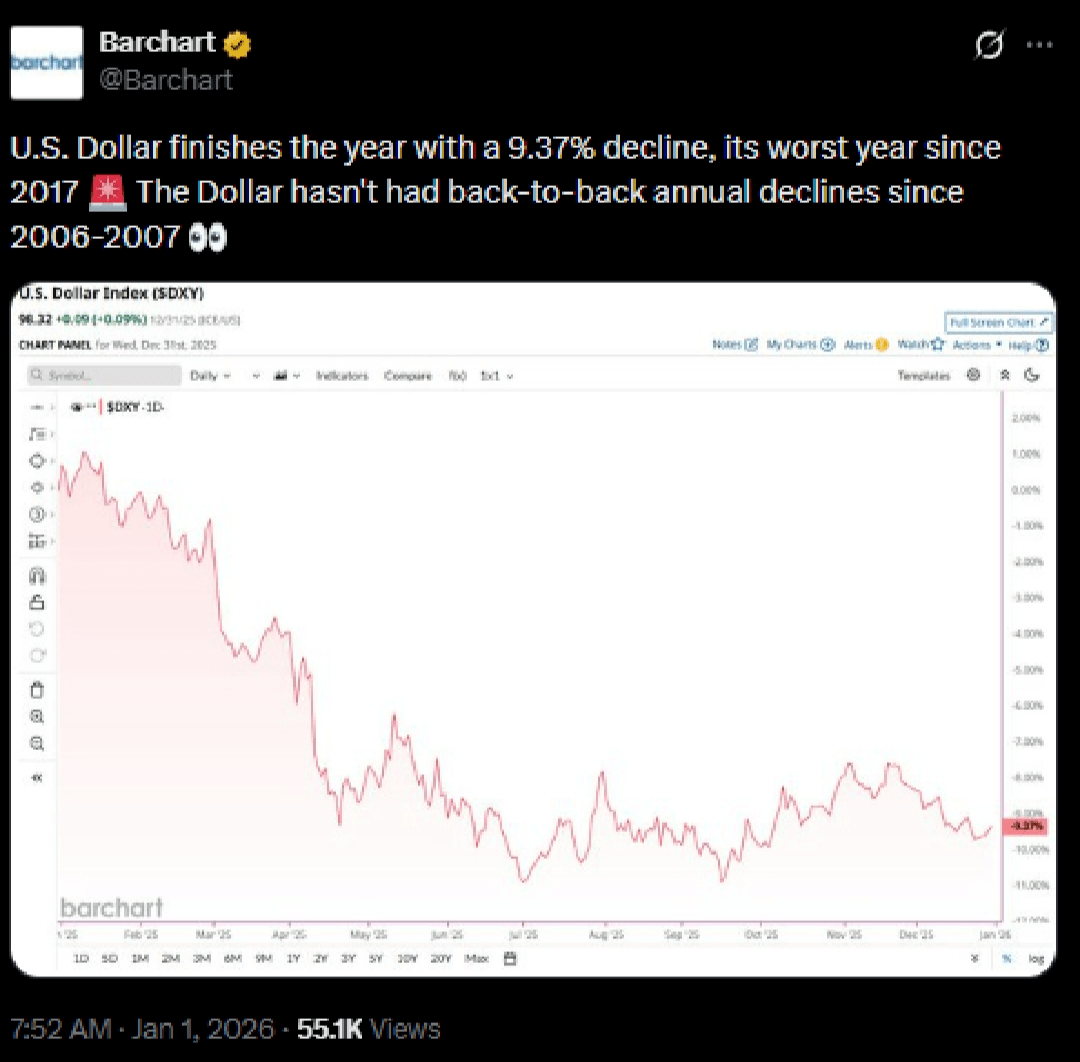 The US Dollar Index’s 9.6% fall in 2025, confirmed by multiple sources, marks its largest annual decline since 2017. Barchart’s 9.37% figure aligns closely with the consensus.