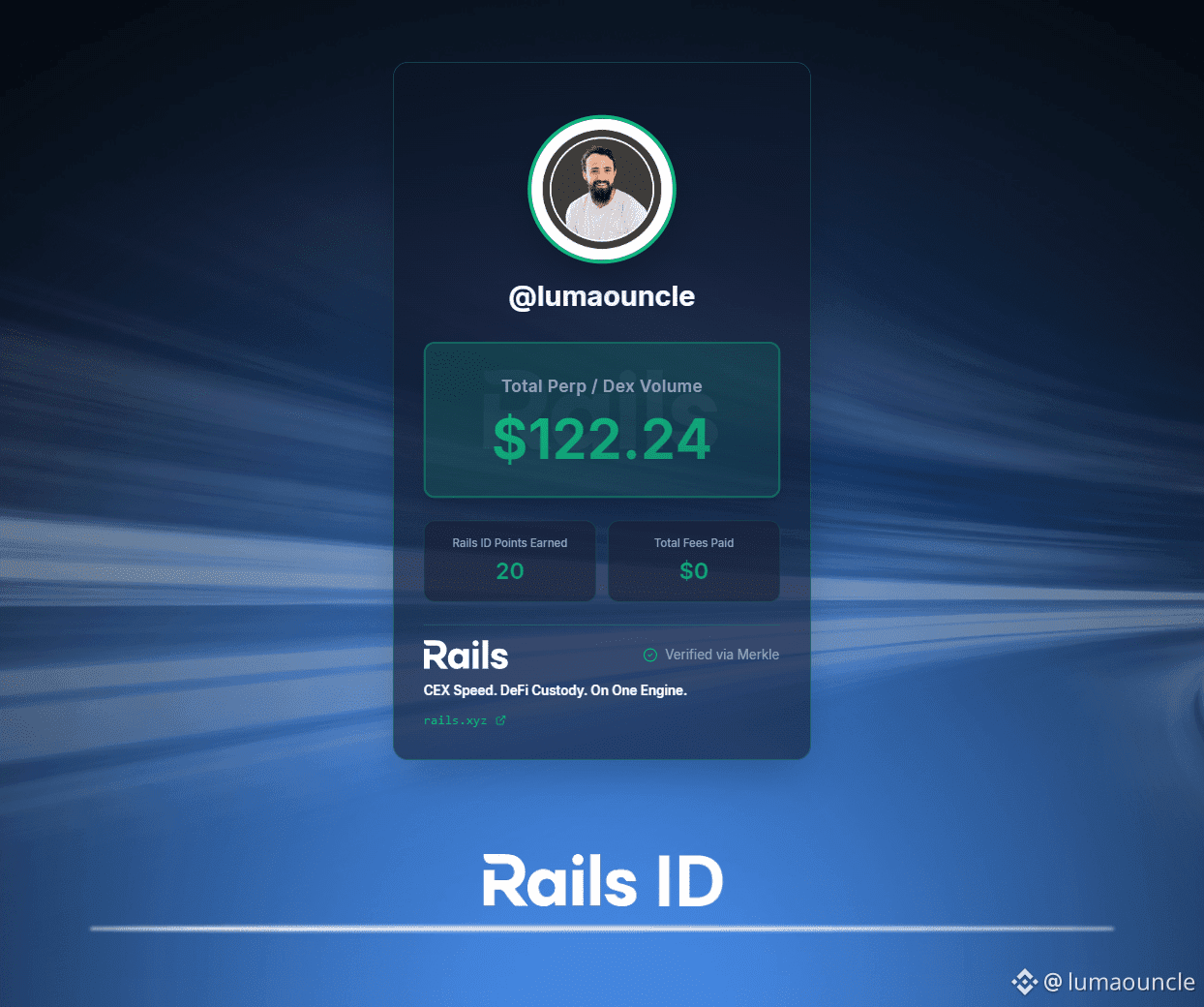 连接 EVM 钱包(如 MetaMask)。 关注官方 X:@rails_xyz。 系统会自动扫描你的历史 DEX/Perp 交易量,转换为基础 Rails ID Points(很多人白捡几十到几百积分)。