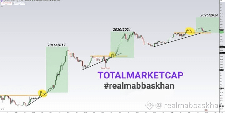 🔥Total Cap Sitting on a 3-Year Trendline (Altcoins Poised for 2026 Rally)🚨🚨 The crypto market’s cyclical rhythm is hard to ignore. Major bull runs almost always kick off after long basing periods and steady uptrends.