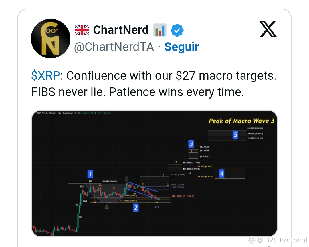 ChartNerd (@ChartNerdTA), um analista de criptomoedas muito respeitado, compartilhou um gráfico de longo prazo do XRP destacando uma confluência entre extensões de Fibonacci e uma estrutura de Ondas de Elliott em desenvolvimento. O gráfico se concentra no par XRP/USD semanal e mapeia uma estrutura que poderia levar o XRP a US$ 27.