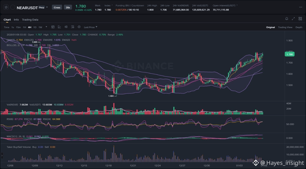 The NEAR/USDT chart on Binance reveals a market in an uptrend structure following a multi-week correction, with price action attempting a breakout from a multi-month range. Currently trading around the $1.70 area, NEAR has rebounded sharply from a local swing low near $1.43, forming an impulsive five-wave advance that suggests accumulation rather than distribution. Observable elements include a volatility expansion marked by widening Bollinger Bands, a rejection at the upper band near $1.80 acting as immediate resistance, and consolidation forming a tight flag pattern above the recent low. The 7-period EMA is sloping upward and crossing above the 25-period EMA, confirming short-term bullish bias, while both lie above the 99-period EMA, anchoring the broader uptrend. Price remains within the upper half of the Bollinger Bands, indicating sustained momentum without overextension. RSI at 58 on the daily timeframe holds in neutral territory, avoiding overbought conditions and supporting potential mean reversion higher, while the MACD histogram has flipped bullish with the line crossing above the signal, aligning with the price lift-off from the $1.43 liquidity pocket. This confluence at the $1.73 pivot—coinciding with prior resistance turned support—marks a high-probability zone, as it represents a 50% Fibonacci retracement of the prior rally and a volume-backed higher low, reducing the risk of immediate downside.