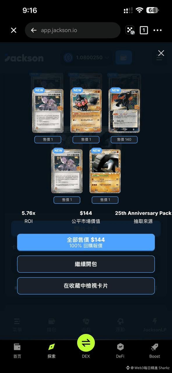 目前我们已看到554%的涨幅,但这只是验证了这个项目的商业模式的良好效果。再举个具体的例子,这两天上线了Pokemon 25周年的卡包,我今天听完教主@Sui教主_Sui is water 直播之后进行抽卡(很旺),25U抽一次,结果得到了5倍多的收益144U。