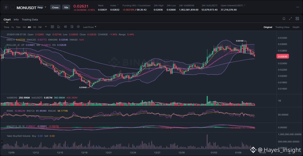 Examining the attached 4-hour chart, MON exhibits a clear breakout attempt from a multi-week ascending triangle pattern, transitioning from consolidation to an impulsive uptrend. The price structure shows a series of higher lows since late December, with local swing highs rejecting at the $0.025 resistance before the recent volatility expansion pushed through to $0.027. Observable elements include a sharp impulsive move on elevated volume, marking the rejection of the lower Bollinger Band and a subsequent consolidation near the middle band, suggesting accumulation rather than distribution. The Exponential Moving Averages (EMAs) reinforce this bullish bias: the 7-period EMA has crossed bullishly above the 25-period EMA, while both remain above the 99-period EMA, confirming an uptrend without signs of mean reversion yet. Bollinger Bands are widening, indicative of expanding volatility that favors continuation over range-bound trading.
