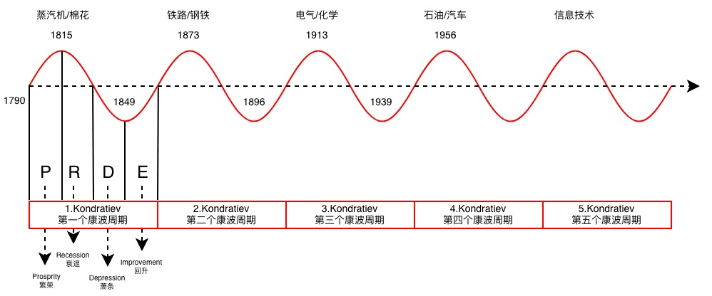 資本主義經濟存在一個約 50 - 60 年 的長週期,稱之康波週期(K-Wave),一個完整的康波週期分為四個階段: