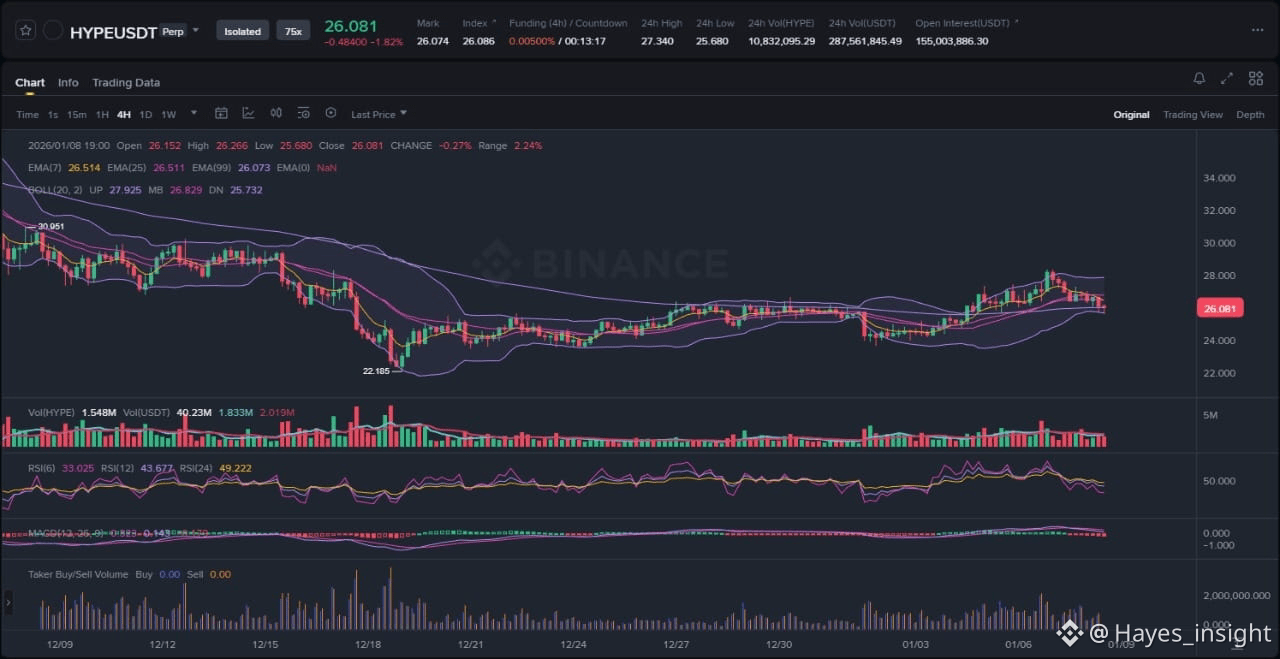 Examining the attached chart, HYPE's price action reveals a clear uptrend structure attempting a breakout from a multi-week range, characterized by an impulsive upward move from the $25 low in late December, followed by consolidation near the $30 level. The candlestick patterns show rejection at local swing highs around $30.20, with a subsequent pullback forming a tight flag pattern, indicative of accumulation rather than exhaustion. Volatility has contracted as evidenced by narrowing Bollinger Bands, squeezing the price between the upper band at $30.50 and the lower at $28.20, which often precedes expansion in either direction.