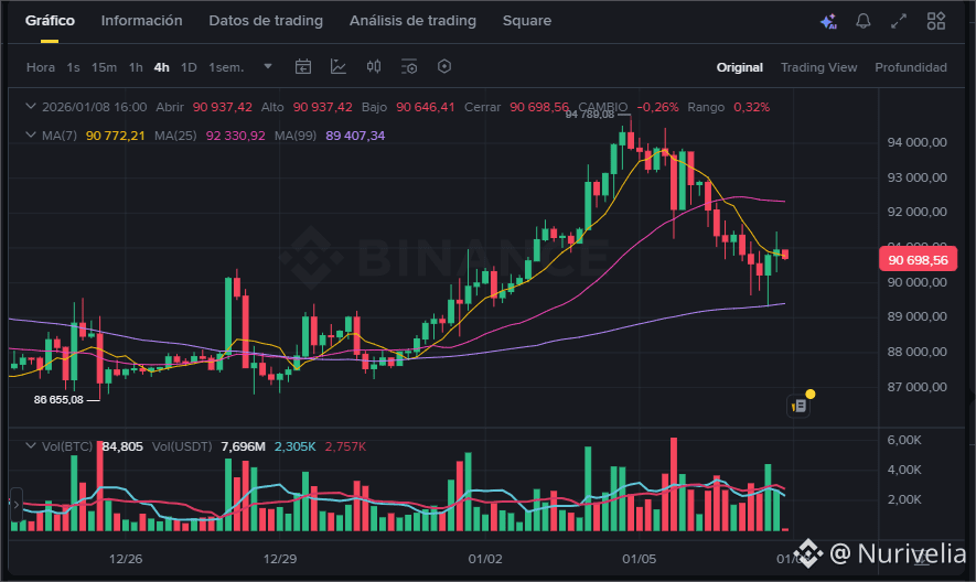 $BTC Estamos en un momento de corrección técnica en #BTC tras haber tocado un máximo reciente cerca de los $94,700. El precio actual de $90,698 está "testeando" una zona de soporte crítica. Aquí tienes el análisis para los próximos dos días (9 y 10 de enero):