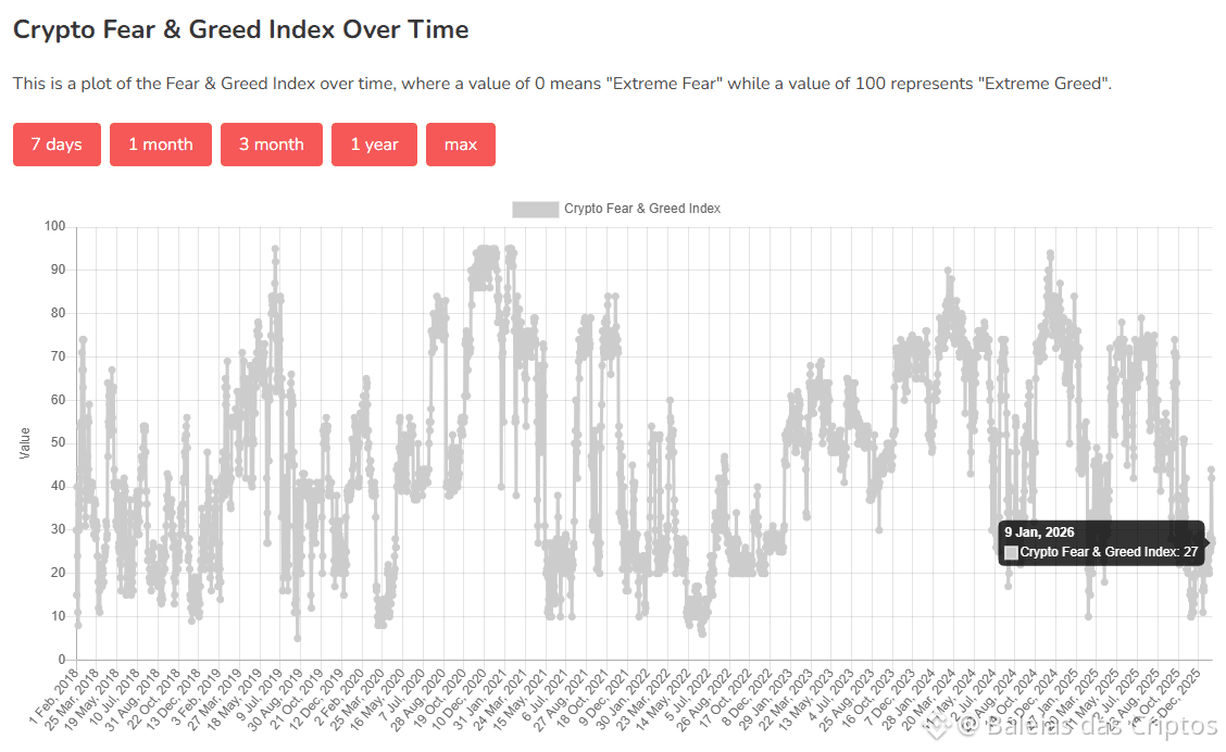 O Crypto Fear & Greed Index aparece em torno de 27, zona clara de medo.
