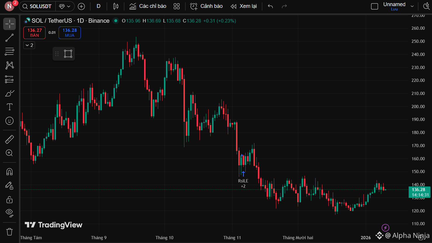 Nhìn SOL khung D, xu hướng giảm là rõ ràng, không cần tranh cãi. Nhưng điều đáng nói nằm ở nhịp đi gần đây. Sau pha rơi mạnh, giá không còn bị đạp liên tục mà chuyển sang dao động hẹp, thanh khoản mỏng dần. Đây là trạng thái rất quen trước khi thị trường đổi nhịp. Những cú hồi gần đây không mạnh, không kích hoạt fomo, nhưng mỗi lần điều chỉnh đều không phá đáy cũ.