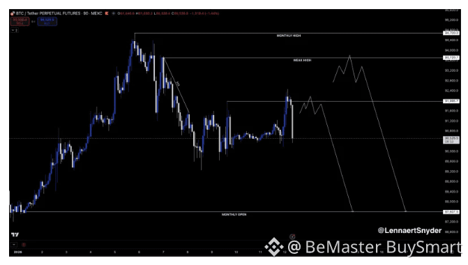 ๐ Two scenarios are in play. On the upside, another push toward the $93,720 weak high could happen, though it risks another rejection if bearish structure holds. Above that sits the $94,700 monthly highโthe line in the sand. A break above would kill the bearish setup entirely. On the downside, $87,600 (the monthly open) is the bigger target, marking a major structural support level.