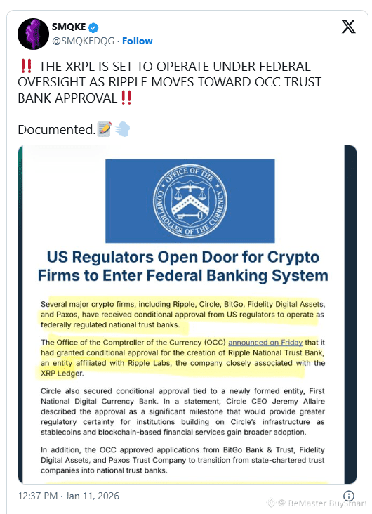 $XRP A shift is taking shape inside the US financial system. It is unfolding through regulatory language rather than market noise. Federal banking authorities have begun granting conditional approvals that bring select crypto-native firms closer to the core of the traditional banking framework.