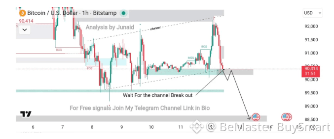 👉 Bitcoin is clinging to the $90,300-$90,500 support zone on the 1-hour chart, which marks the bottom edge of its current rising channel. After pulling back sharply from above $92,000, BTC has stabilized at this level. The chart shows multiple bounces around this zone, making it a crucial area for near-term price action.