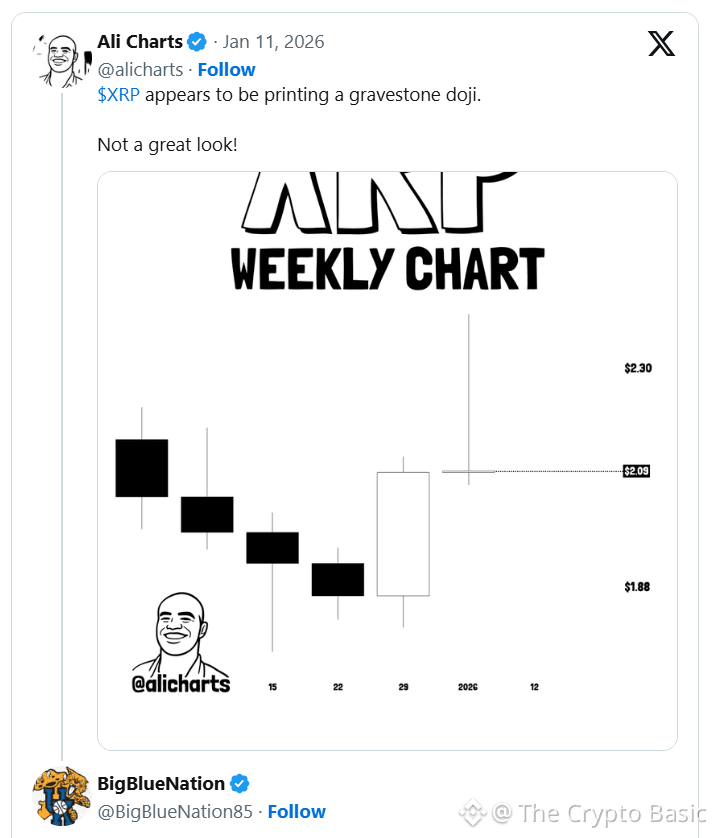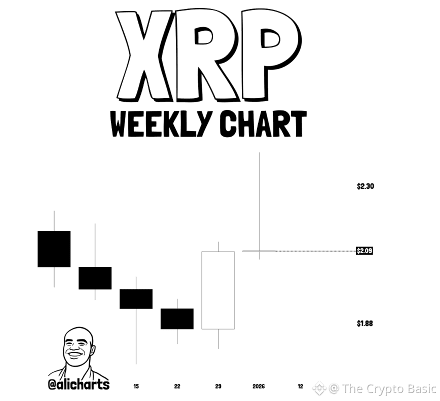 Last week, XRP did exactly this, dropping from its $2.41 high to its opening price of $2.09, then closing at $2.073. According to Martinez, this does not look good for XRP, suggesting it might fall much further.