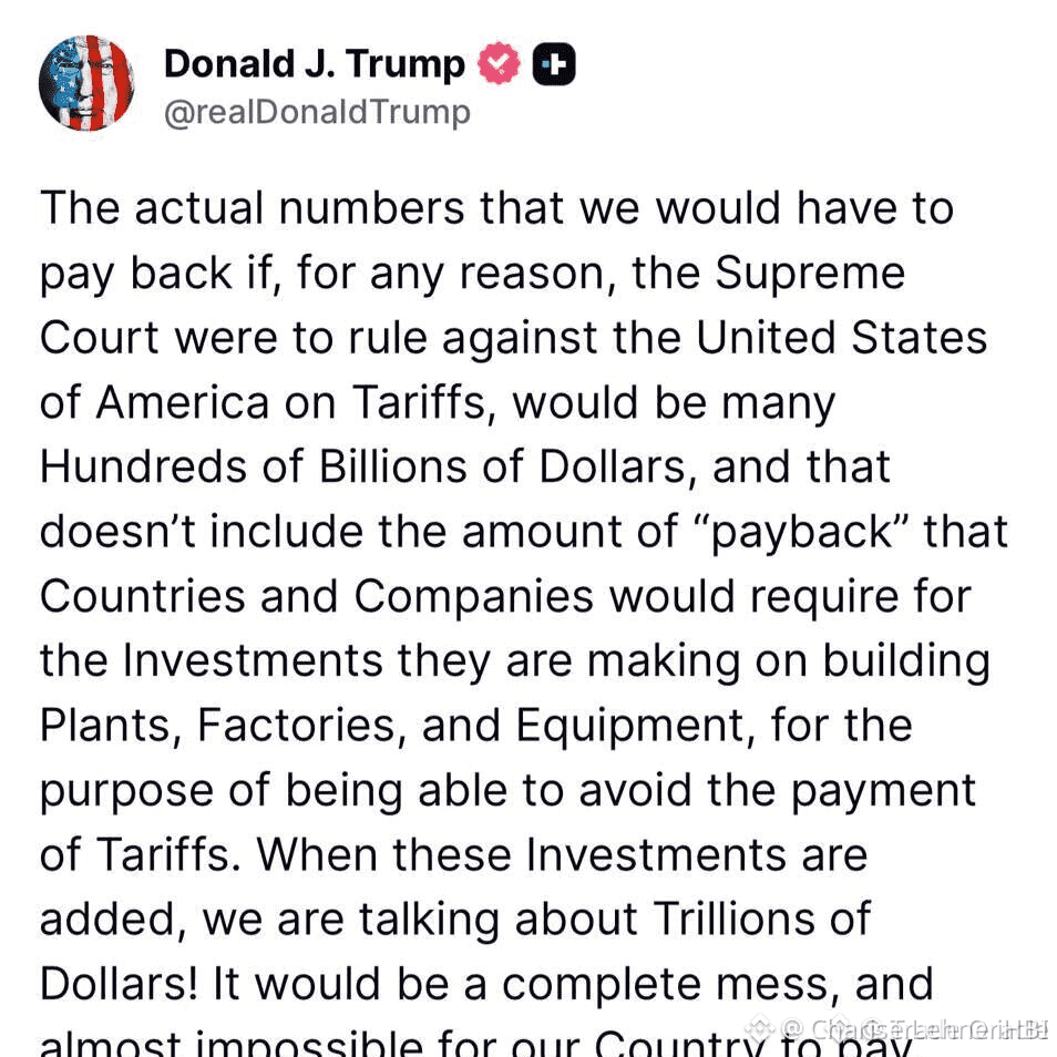 🇺🇸$BTC The stakes for America just skyrocketed. Former President Donald Trump issued a powerful warning that if the U.S. Supreme Court overturns existing tariffs, the consequences could be economically catastrophic for the nation. 💥