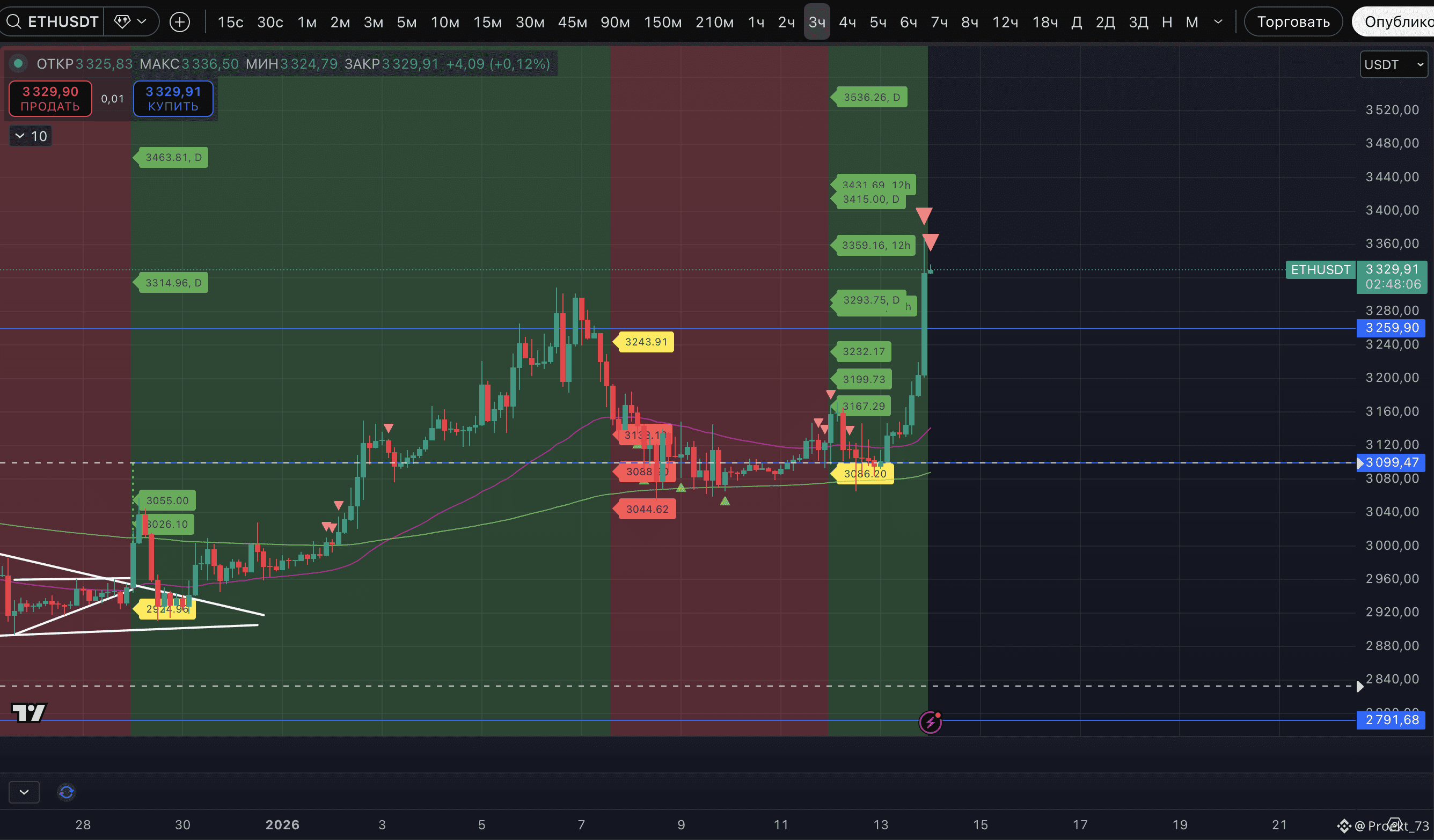 - У ETH уже вторая Strong signal потенциального хая на 3-часовом (!) ТФ (с таким раскладом при даунтренде на 5-минутном ТФ в лучшем случае будем ждать разгрузку перекупленности в рендже).