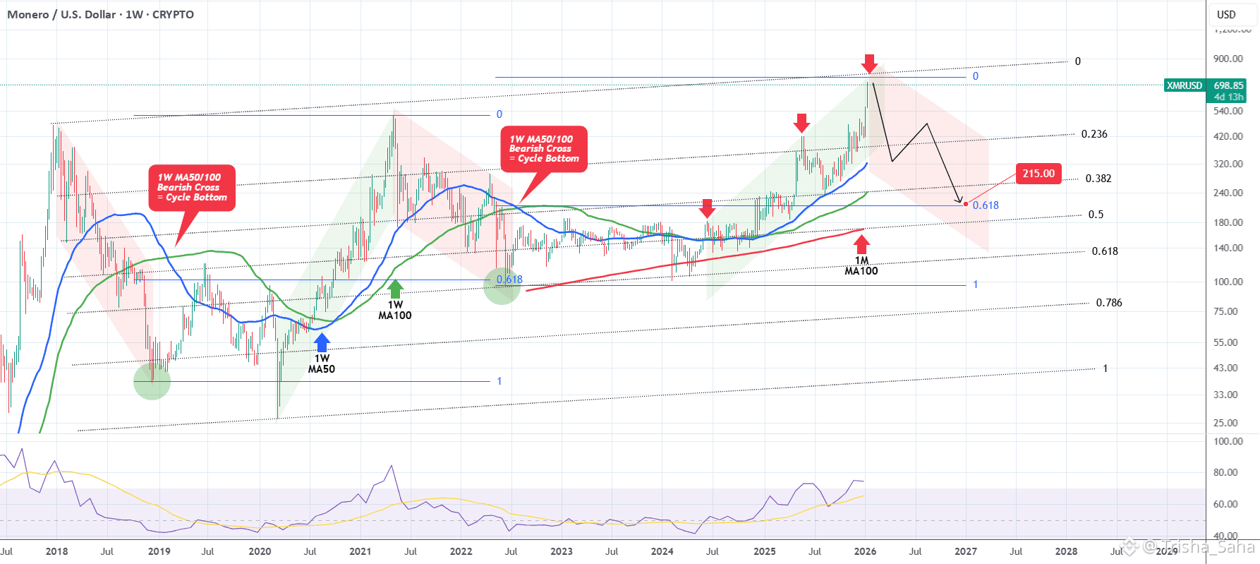 With the last one bottoming on the 0.618 Fibonacci retracement level, just above the 1M MA100 (red trend-line), we estimate that the emerging Bear Cycle will hit at least $215 before bottoming.