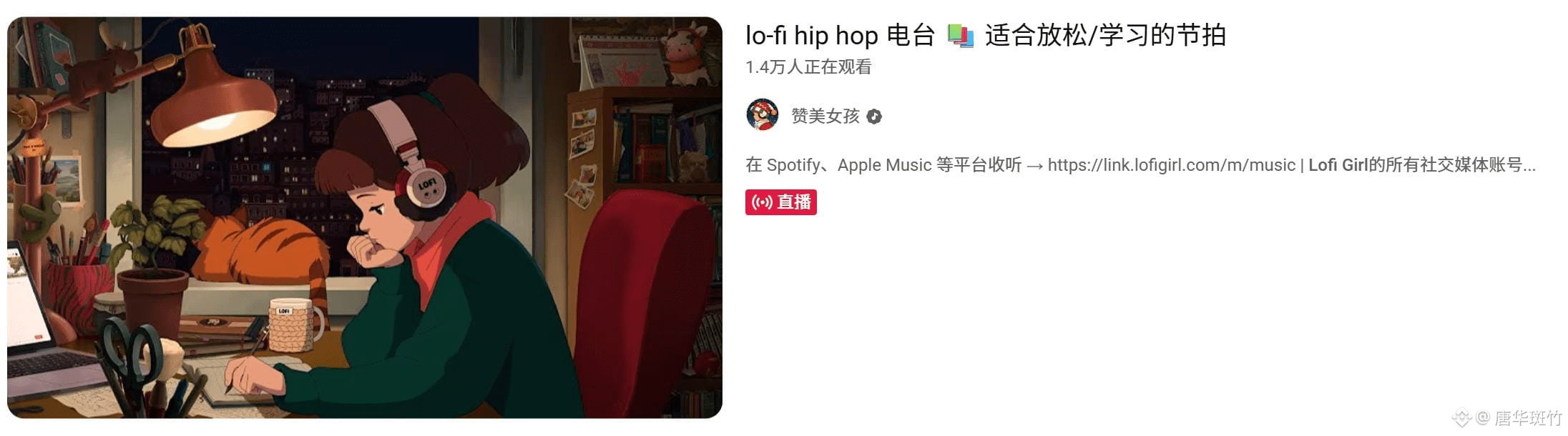 这个账号是直播的形式,但本质逻辑一样。这个戴耳机写作业的二次元女孩,也是靠着24小时不间断的轻音乐,给人提供放松和学习的氛围,养活了一个庞大的团队。