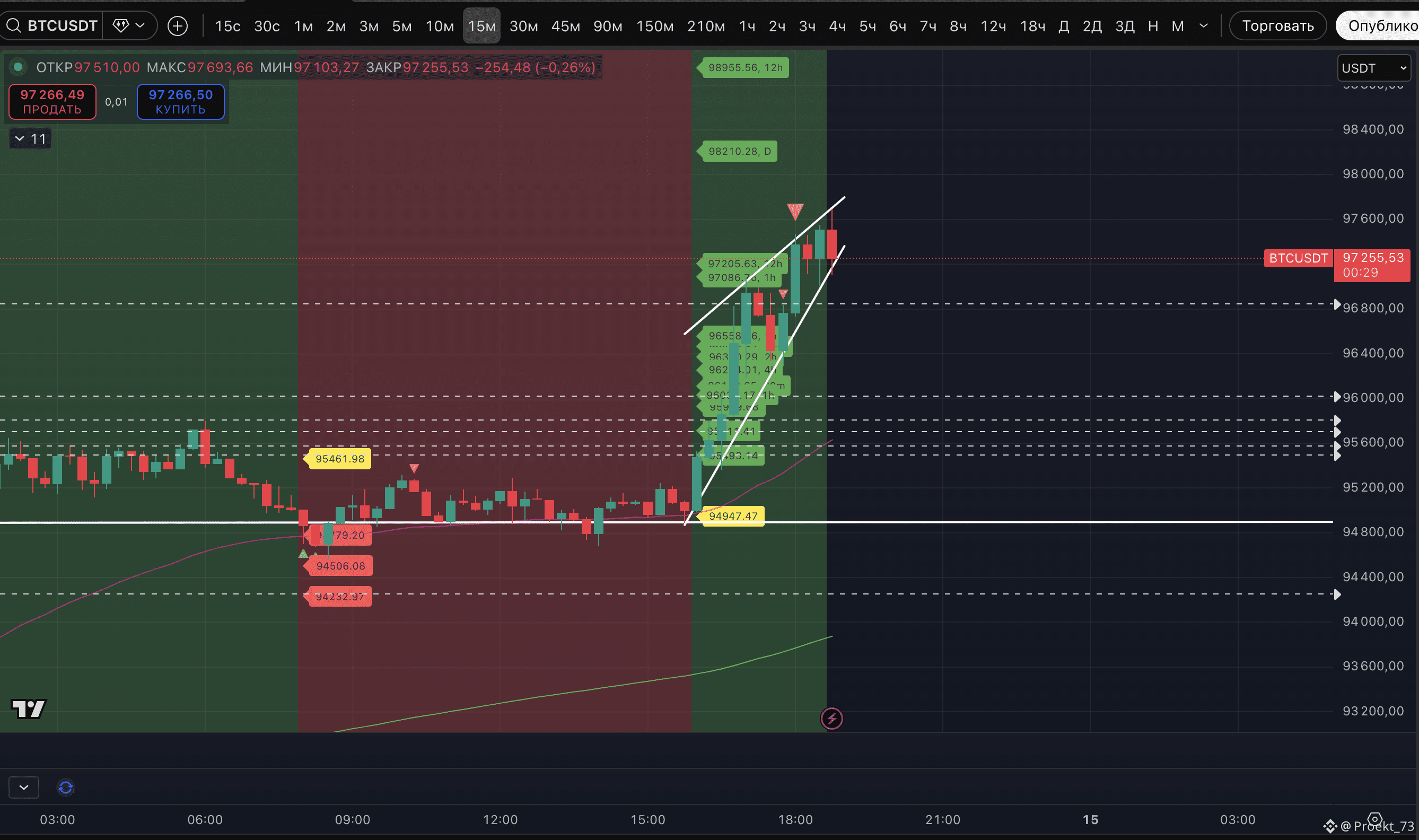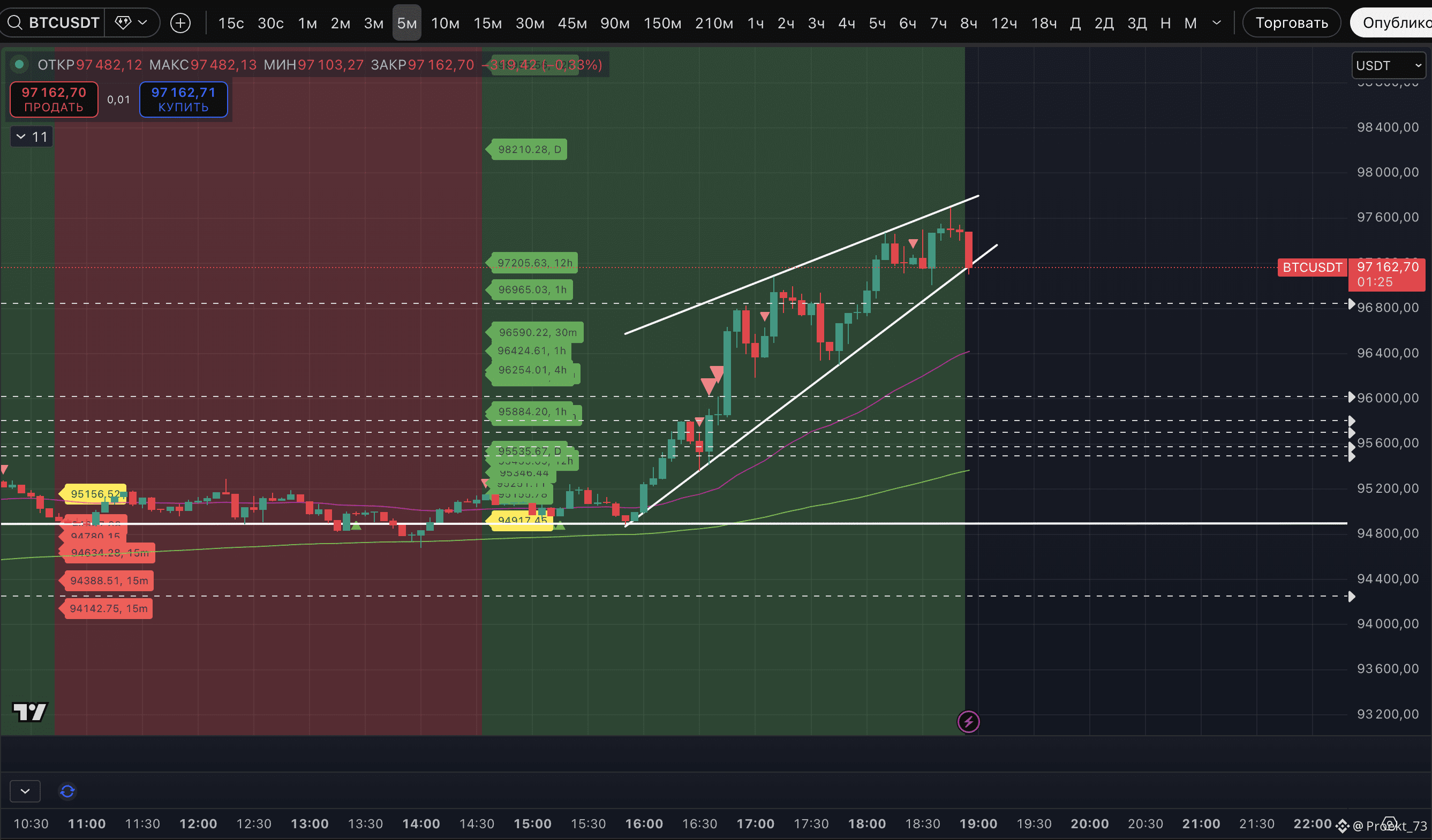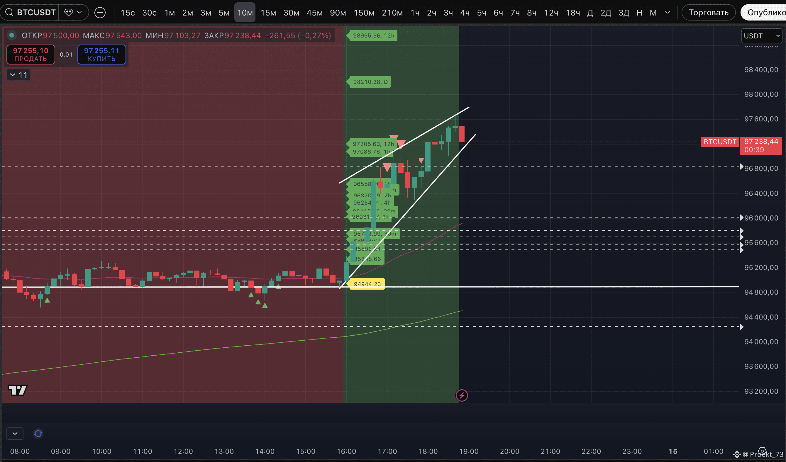 Курс BTC во второй половине дня пробил 97 000$ и дает понять, что говорить о старте коррекции рано. Цена за сегодня, вернув аптренды на 5-, 10- и 15-минутном ТФ, забрала всю плотность целей по ним.