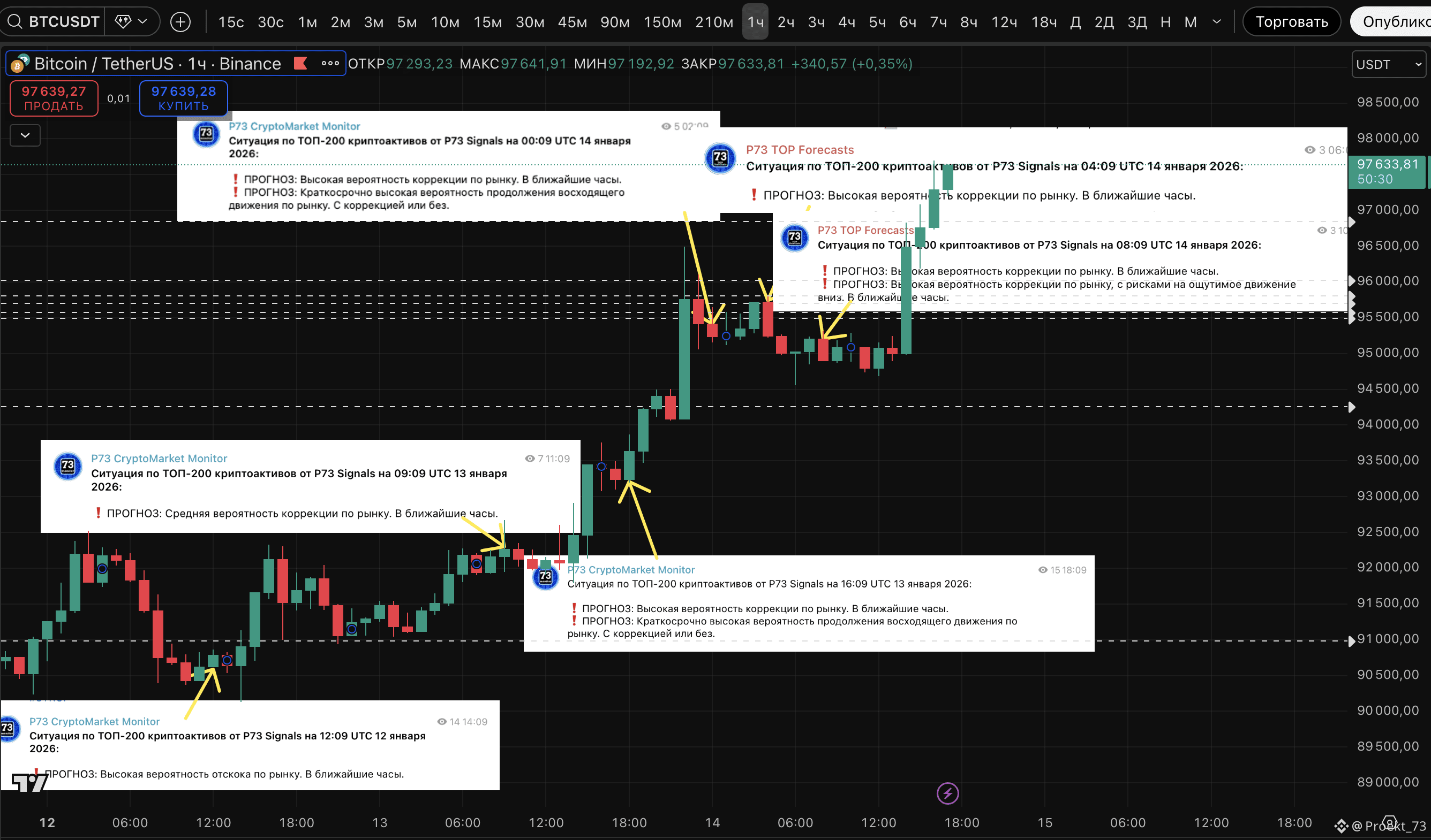 ps: отдельно отметим, что сегодняшним ростом были сломлены сигналы к коррекции рынка от нашего P73 CryptoMarket Monitor. Алгоритм хорошо спрогнозировал движения 12 и 13 января, но сегодня дал промах.