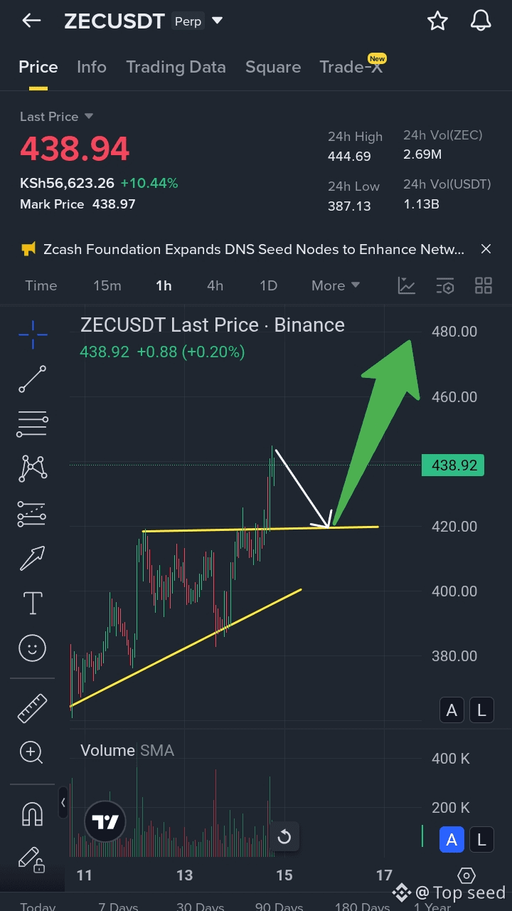 ZEC responded strongly, breaking above the $420 resistance and confirming a bullish market structure.
