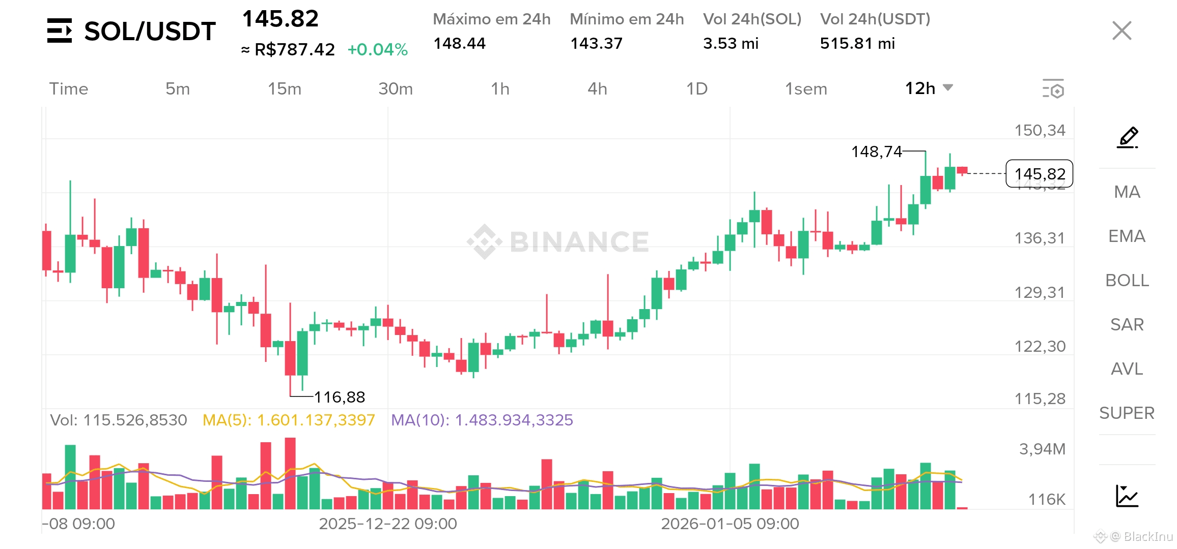 SOL/USDT negociando em 145.82 (+0.04% no dia), em um canal lateral estreito entre 143.37 (suporte) e 148.44 (resistência).